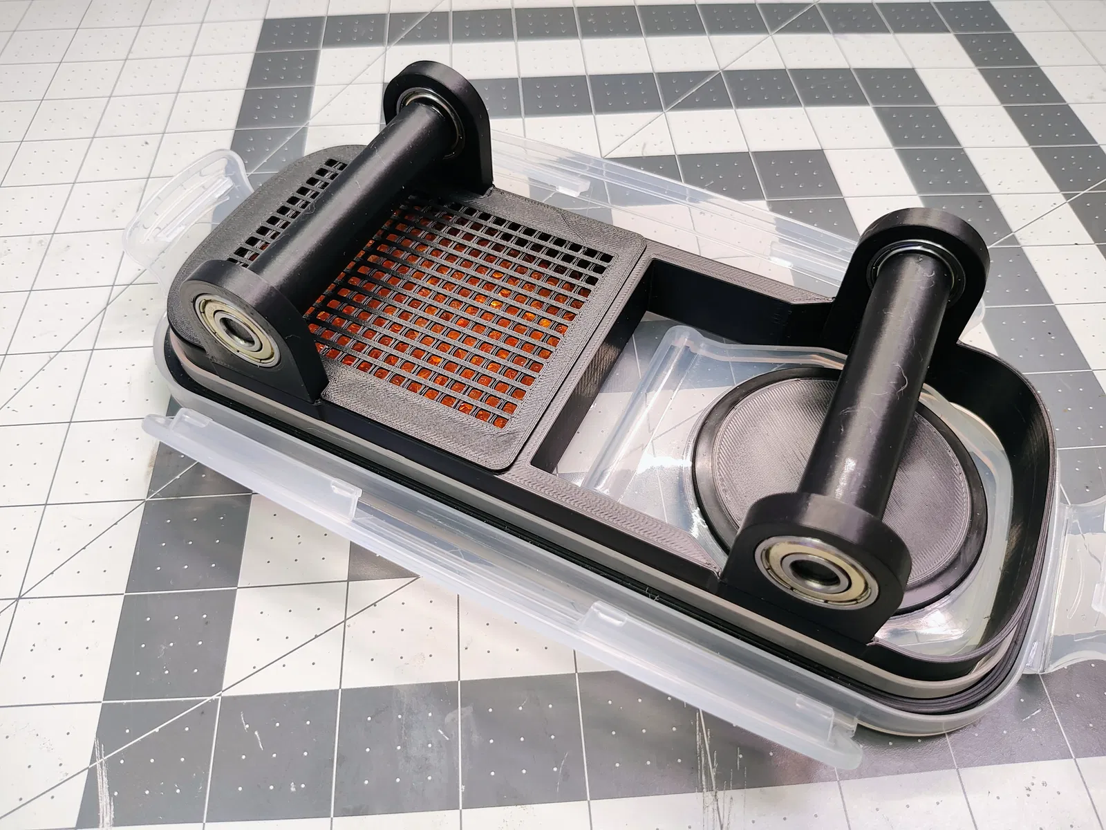 - Nắp đế vừa với đế trước khi lắp cụm trục vào vị trí. Nó có thể được sử dụng để chứa chất hút ẩm rời. Bạn có thể sử dụng một nắp đế và đổ đầy một nửa đế bằng chất hút ẩm, hoặc in hai nắp đế và đổ đầy toàn bộ đế. Lưu ý rằng nếu bạn dự định sử dụng tùy chọn sấy khô chủ động, tôi khuyên bạn chỉ nên đặt chất hút ẩm ở nửa sau của đế để lỗ tròn dễ dàng tiếp cận cho bộ phận gắn bộ sấy.