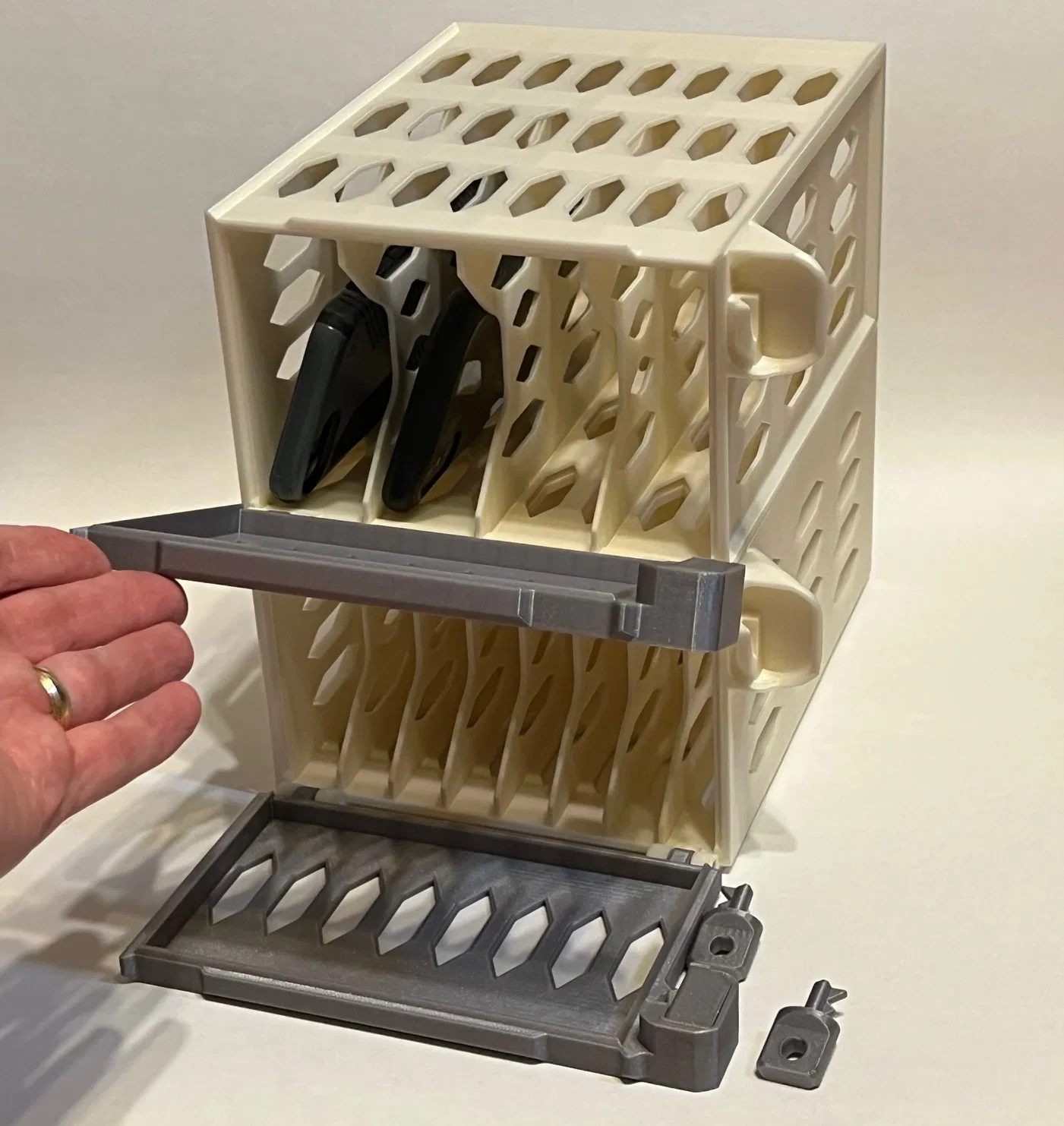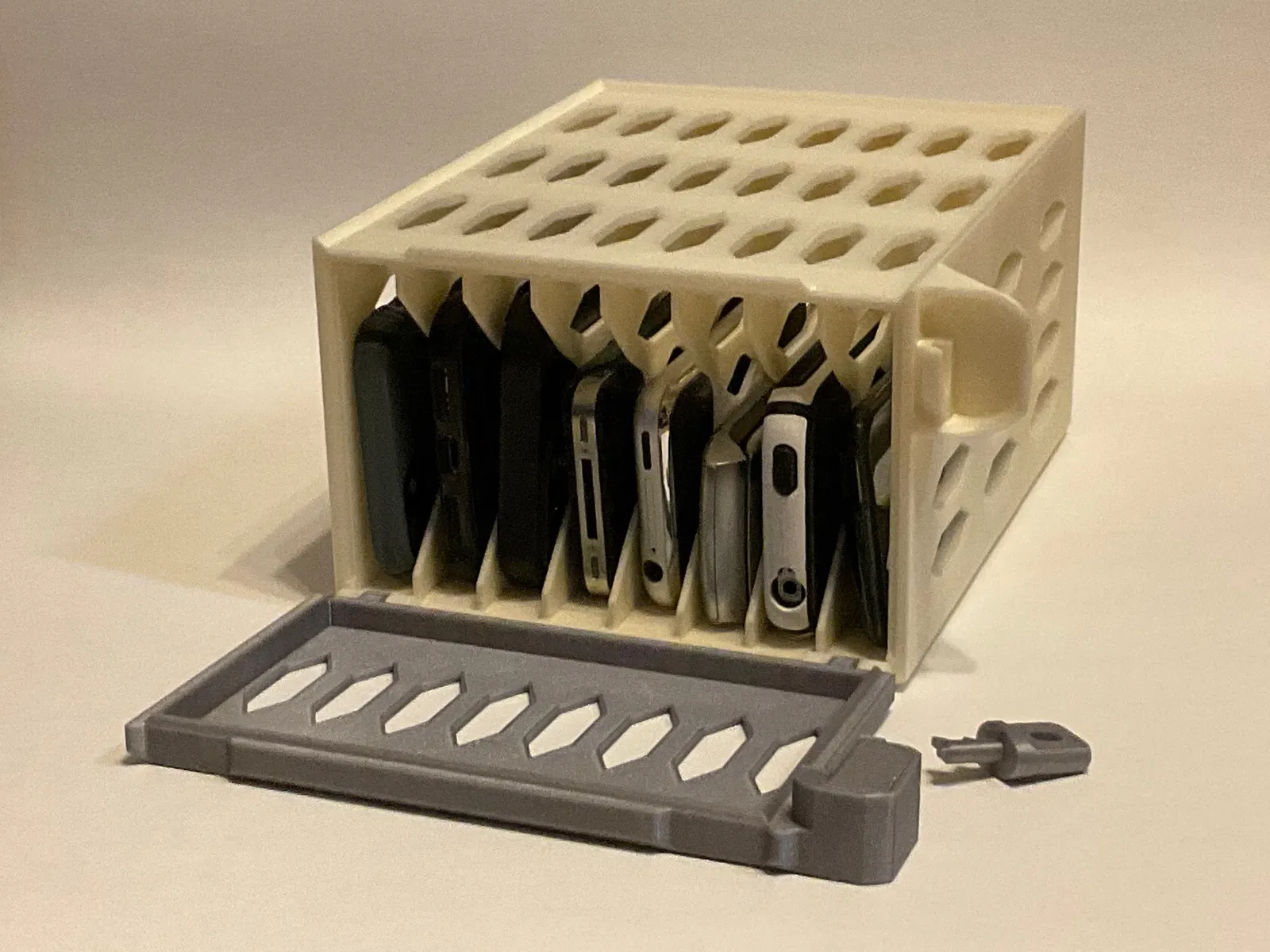 Khóa điện thoại để tránh xao nhãng, phù hợp cho gia đình, tiệc tùng, hoặc để tránh cám dỗ kiểm tra điện thoại giữa đêm. Có phiên bản 4 và 8 điện thoại, thiết kế xếp chồng, có lỗ sạc. Cơ chế khóa in-place, không cần supports. Phiên bản STEP 4 điện thoại có sẵn.