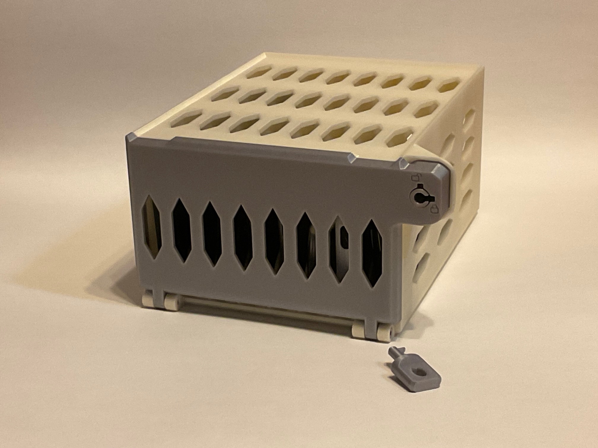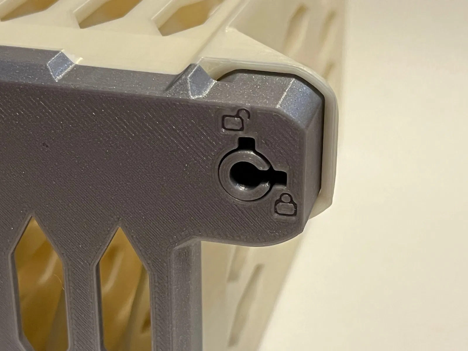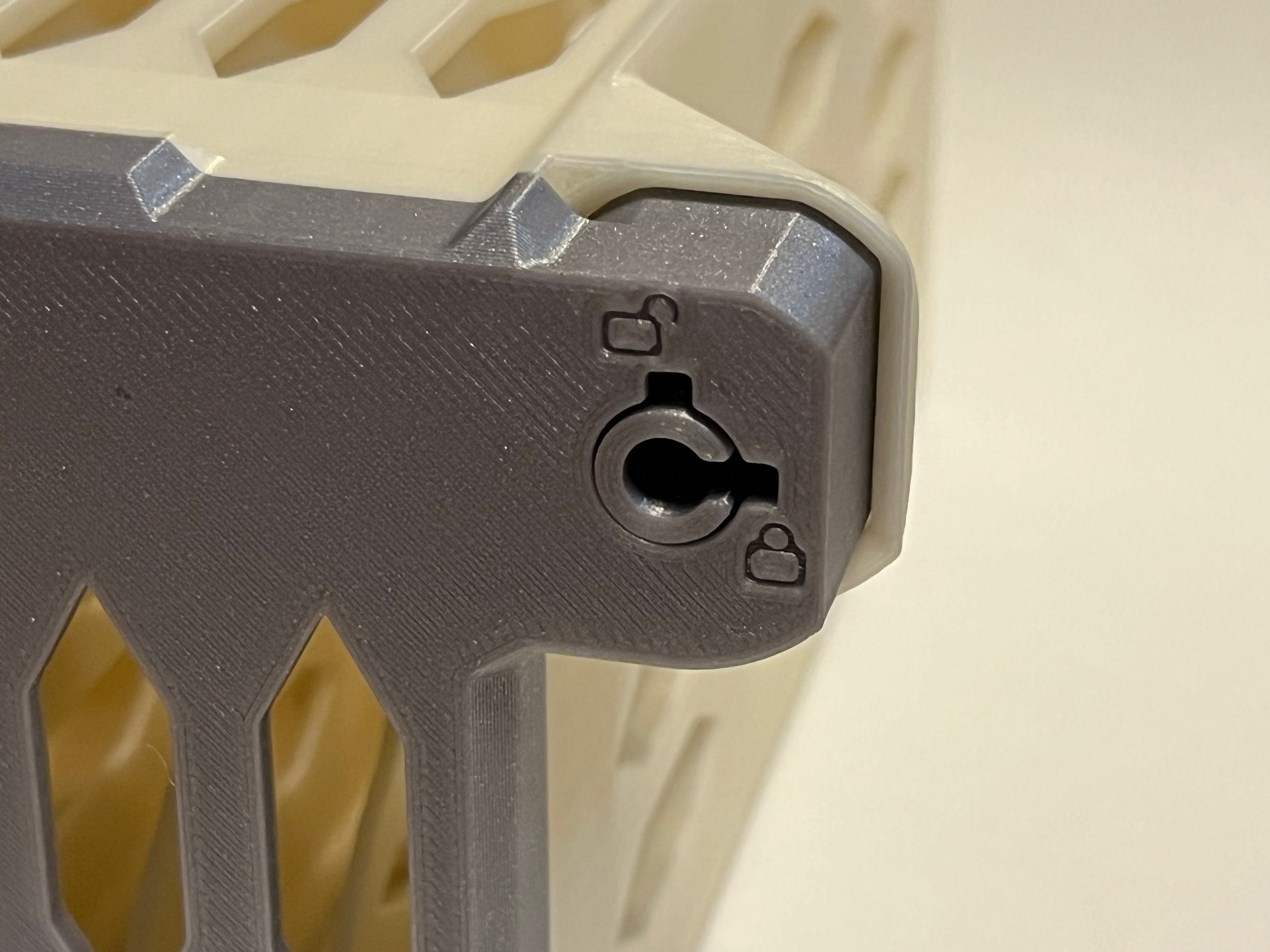 QUAN TRỌNG: khi cắm chìa khóa, hãy đẩy hết cỡ vào cho đến khi chìa khóa phẳng với bề mặt trước của khóa. Điều này sẽ ngắt lẫy khóa trên nắp khóa để trụ khóa có thể xoay. Cố gắng xoay chìa khóa mà không đẩy hết cỡ trước sẽ rất khó khăn, và cuối cùng có thể làm gãy lẫy khóa. Nếu vì lý do nào đó mà lẫy khóa bị gãy, nó có thể được sửa chữa bằng cách in và gắn một nắp khóa mới.