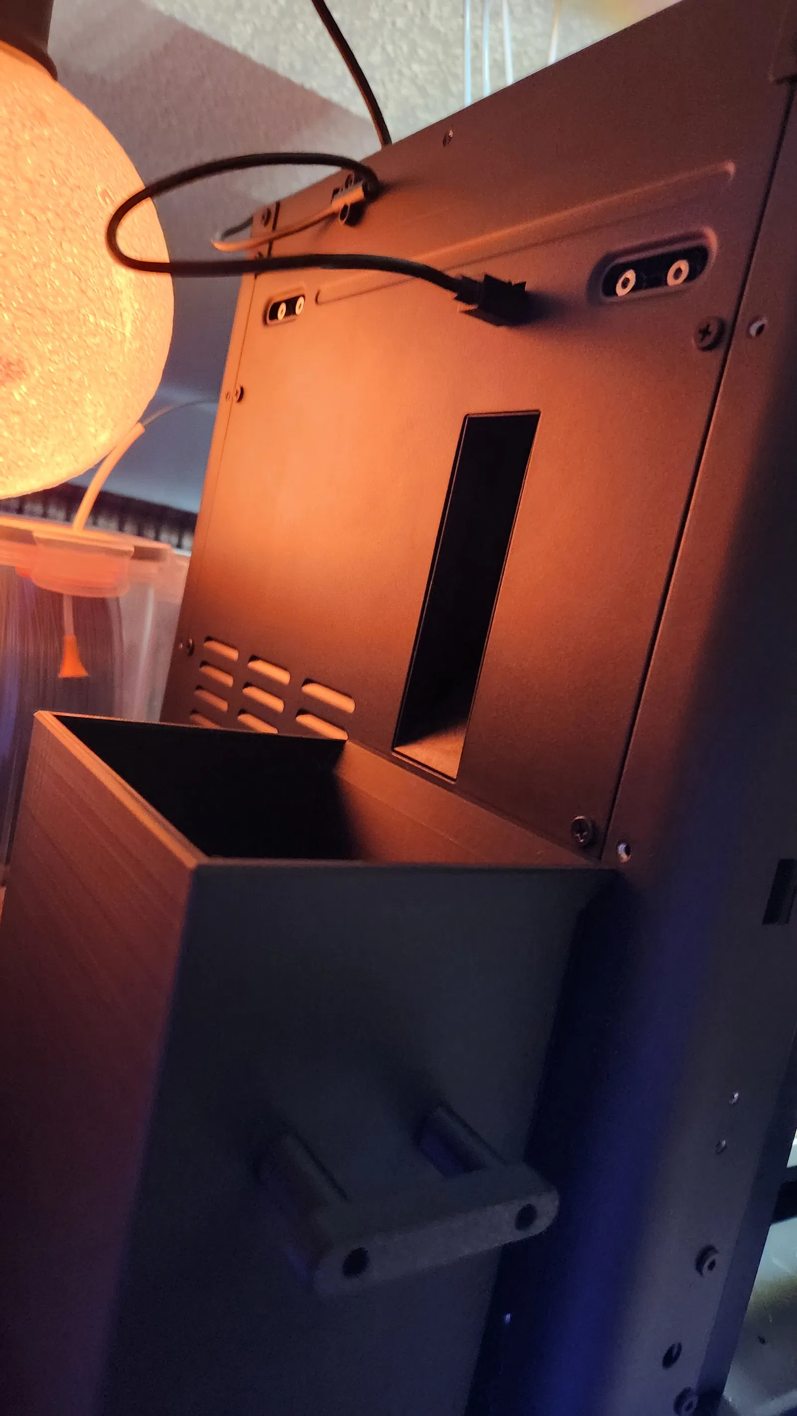 - Tôi đã cập nhật thùng rác với tùy chọn thêm 3 nam châm ở gờ trước để giữ thùng rác áp sát vào máy in. Bản in thử của tôi là ép chặt, nhưng có thể cần hoặc không cần keo để giữ nam châm.