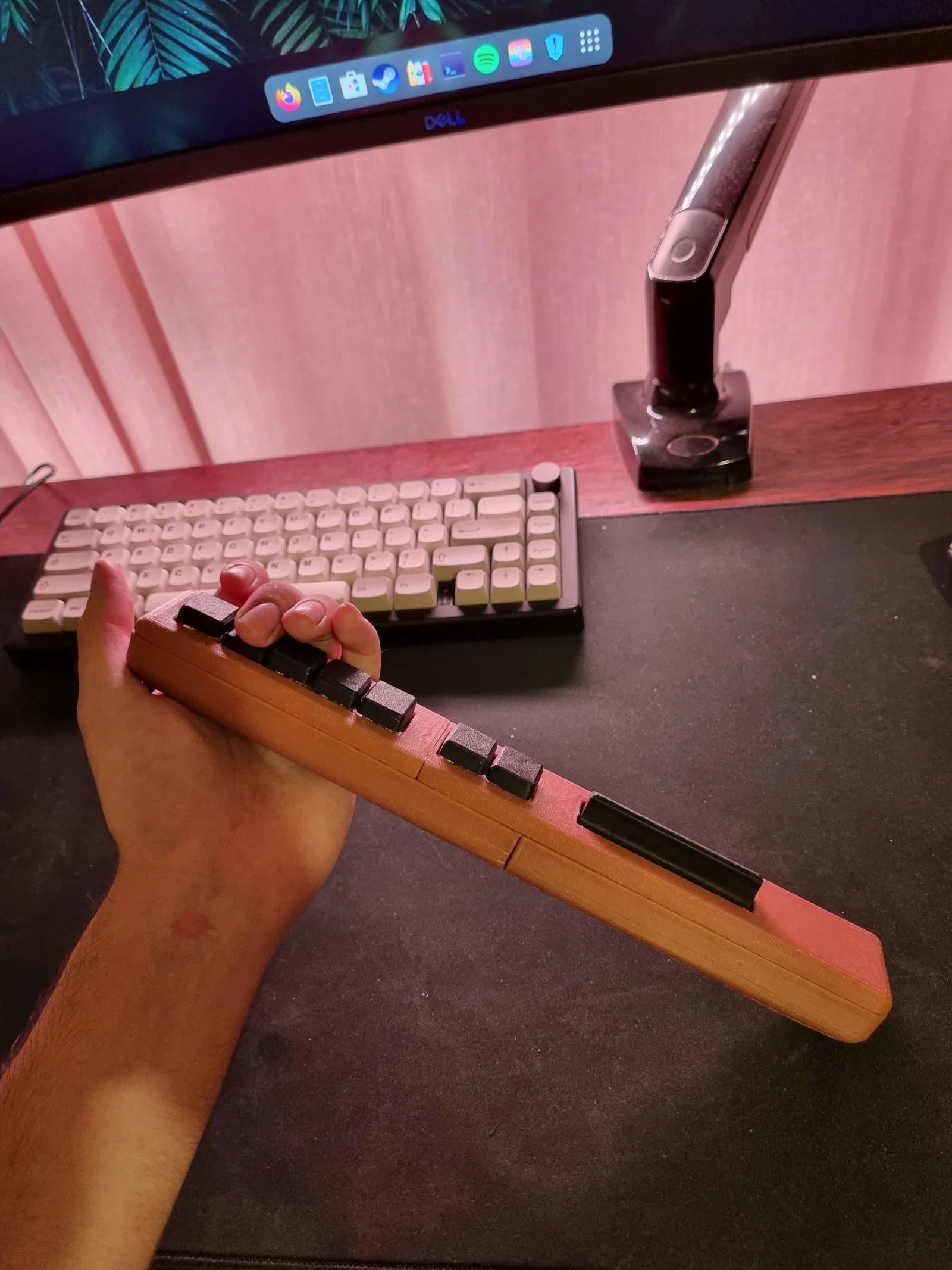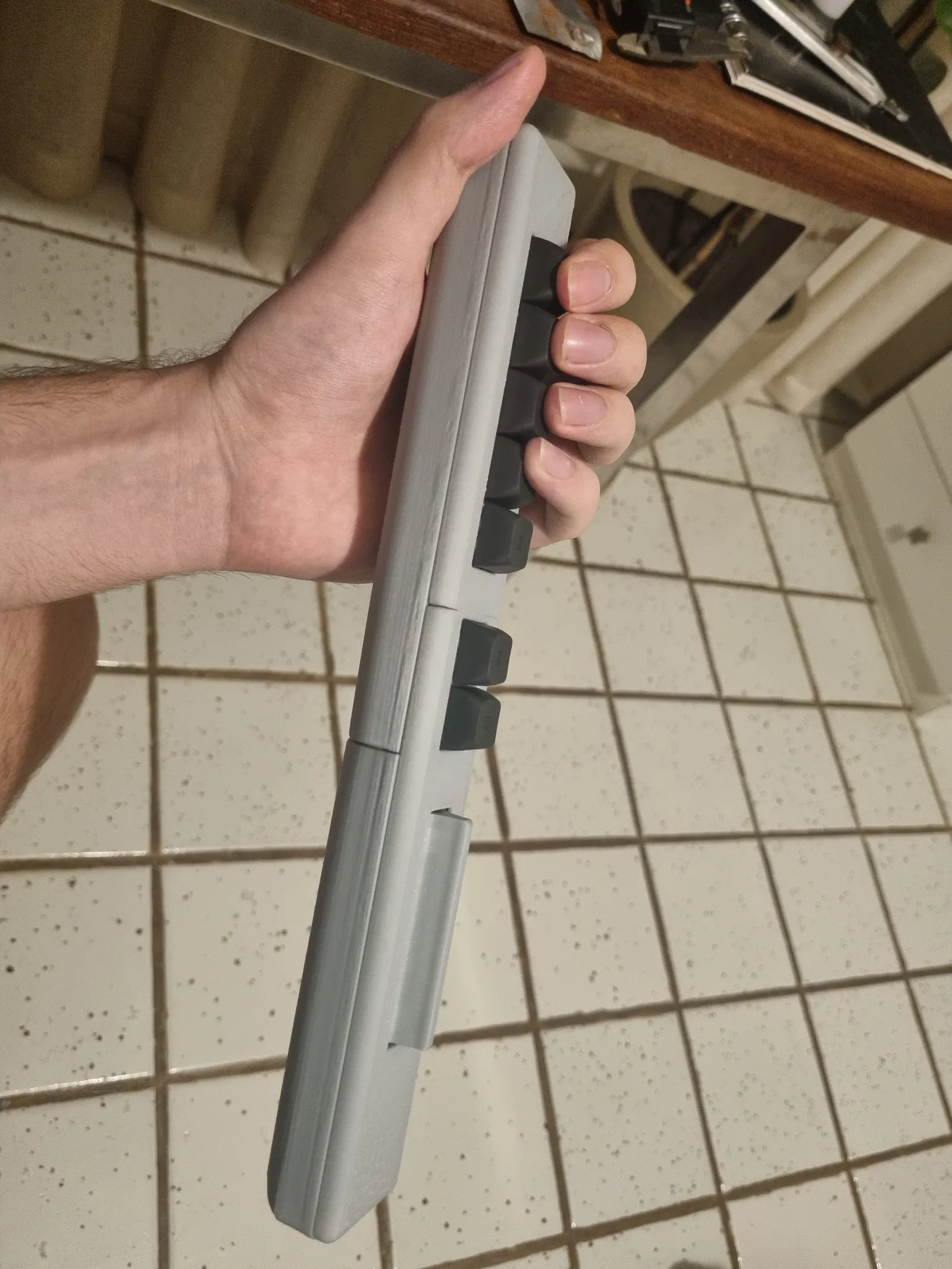 Tôi muốn một bộ điều khiển Clone Hero nhỏ gọn như Minibar, nhưng vì tôi quen chơi trên bàn phím, tôi thấy các nút hình đàn guitar quá xa nhau và không thoải mái. Để giải quyết vấn đề này, tôi đã thiết kế một bộ điều khiển mới sử dụng các công tắc và keycap bàn phím cơ tiêu chuẩn. Kết quả là một bộ điều khiển mang lại cảm giác giống hệt như chơi trên bàn phím—với ưu điểm bổ sung là thanh strum.