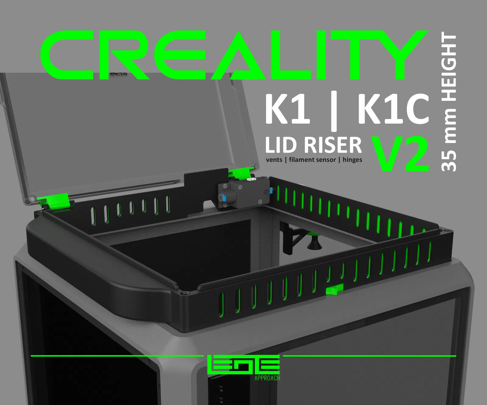 Bộ nâng nắp v2 cho CREALITY K1 | K1C | K1SE, cao 35mm và không có đèn LED. Bản cập nhật bao gồm các bức tường mới, góc mới cho vít 10mm, và thiết kế góc mới để cố định dây LED. Hướng dẫn chi tiết và các tệp đính kèm có sẵn. Liên hệ nếu có thắc mắc hoặc cần hỗ trợ lắp ráp.