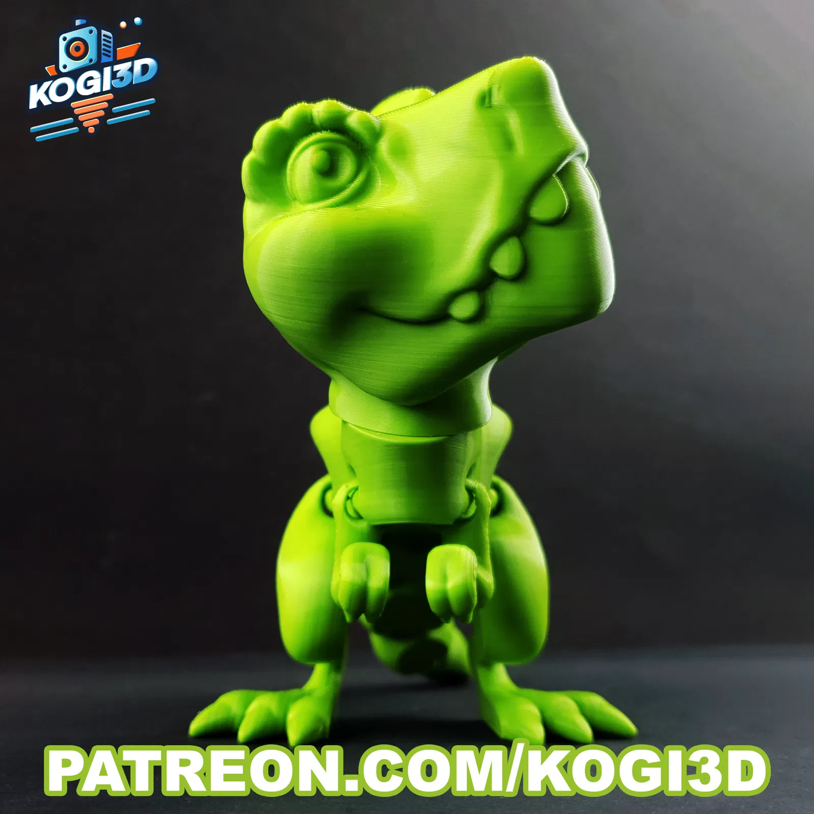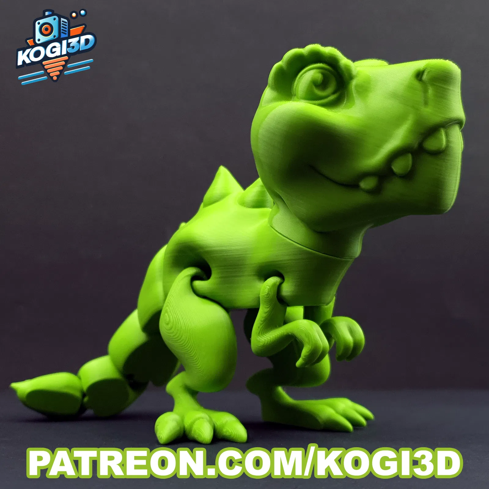 Mô hình khủng long T-Rex phong cách hoạt hình có khớp nối, với thiết kế vui nhộn và các bộ phận chuyển động được. Thích hợp cho in 3D cá nhân.
