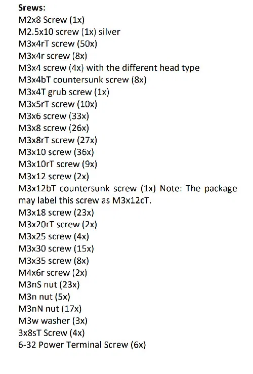 Tôi muốn sắp xếp trước các bộ phận cho bộ kit Core One của mình trước khi bắt đầu lắp ráp. Do đó, tôi đã sao chép các thành phần từ hướng dẫn lắp ráp vào một tài liệu duy nhất. Các bộ phận được sắp xếp theo các bước xây dựng và cả theo gói. Điều này cho phép bạn kiểm tra xem có đầy đủ hay không trước khi bắt đầu lắp ráp.
