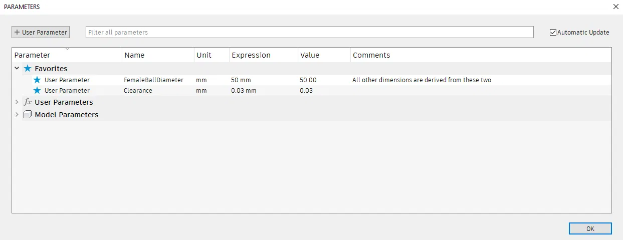 Cái "Ống hút bụi dạng khớp nối linh hoạt" của teslapunk đúng là thứ tôi đang tìm, nhưng tôi cần thiết kế các đầu nối khác nhau. Tôi đã tái tạo các khớp nối trong F360 với các tham số người dùng để dễ dàng điều chỉnh kích thước cũng như thiết kế các bộ phận bổ sung khi cần.