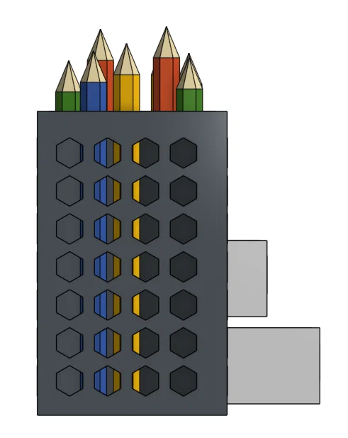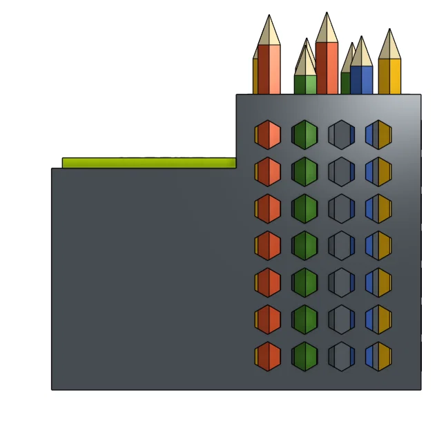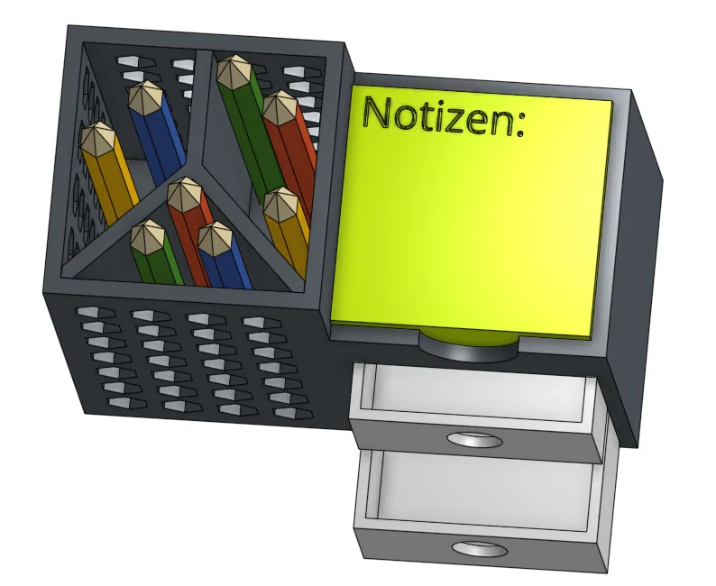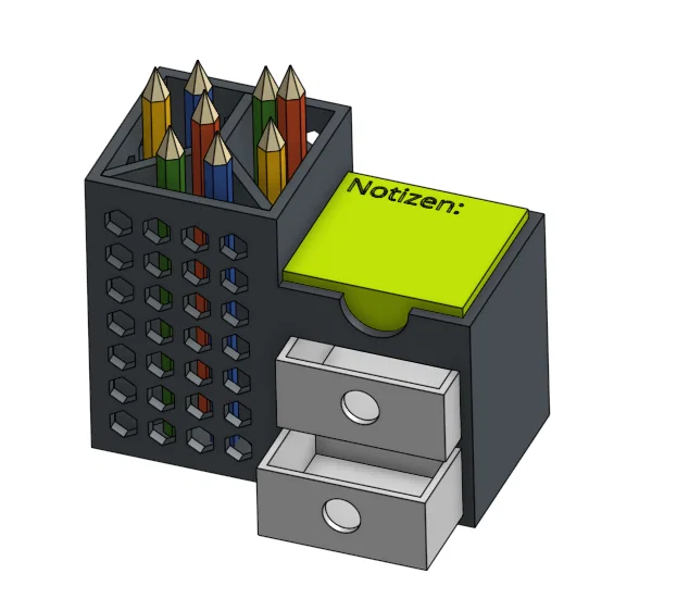 Đây là một cái đế cắm bút với chỗ để cắm bút, giấy ghi chú và/hoặc để các vật dụng nhỏ như USB và cục tẩy.