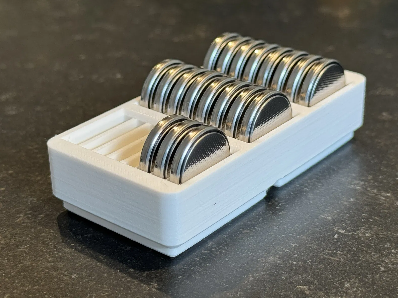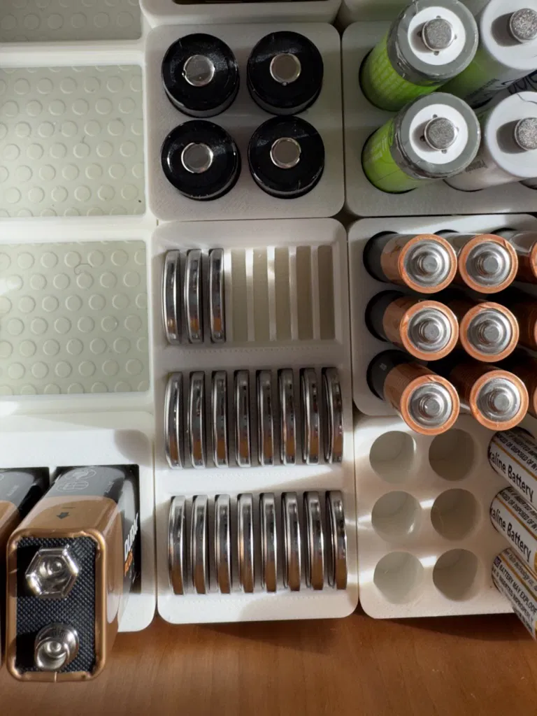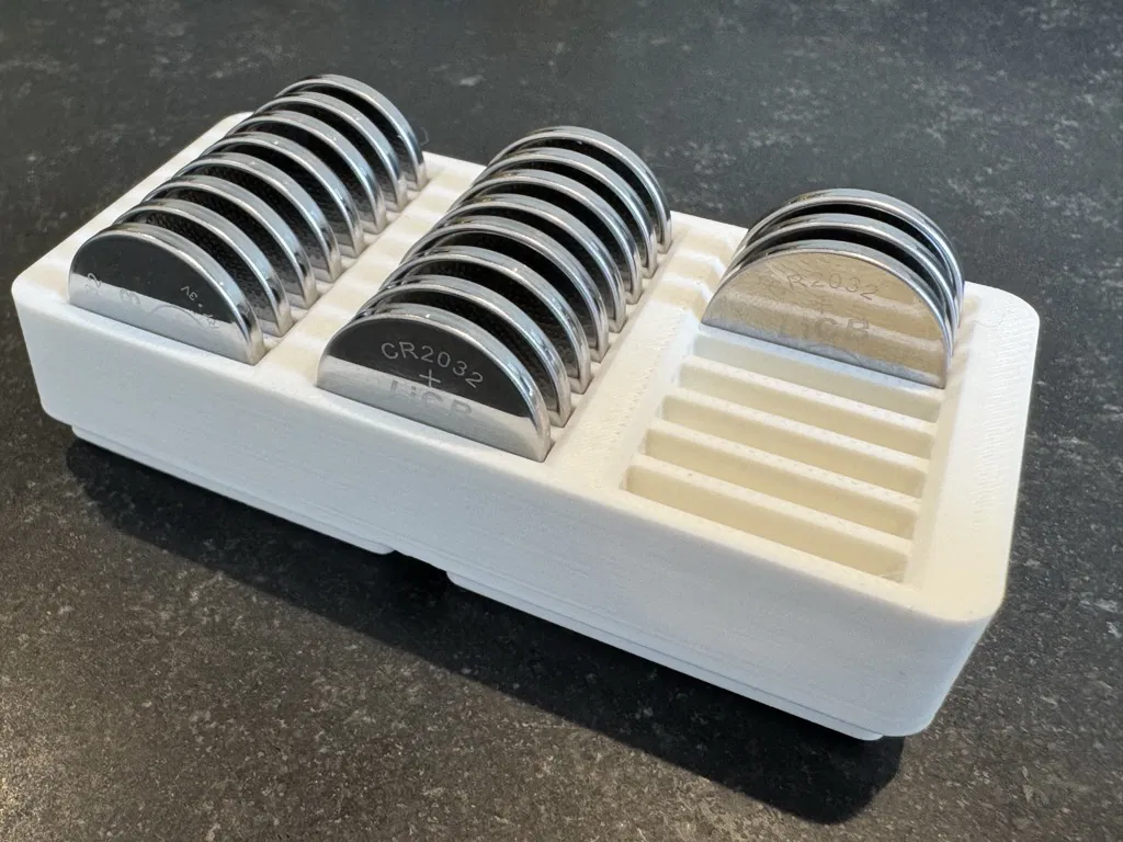 Hộp lưu trữ Gridfinity 2x1x2U. Chứa được 24 viên pin 2032. Thiết kế hơi thấp hơn, có khoét tròn ở đáy cho pin tròn.