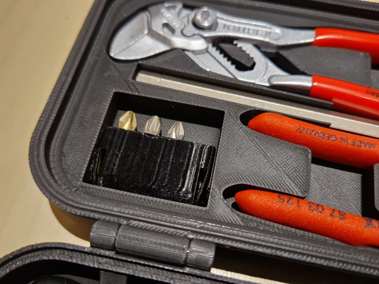 Khay đựng cho nắp hộp Wera Tool Check Plus Rugged Box, chuyên dùng để chứa kìm Knipex Cobra, kìm Knipex Mini-Pliers Wrench, bộ giữ bit 152mm và 8 bit 25mm. Bộ giữ bit được in bằng TPU và nam châm giữ kìm.