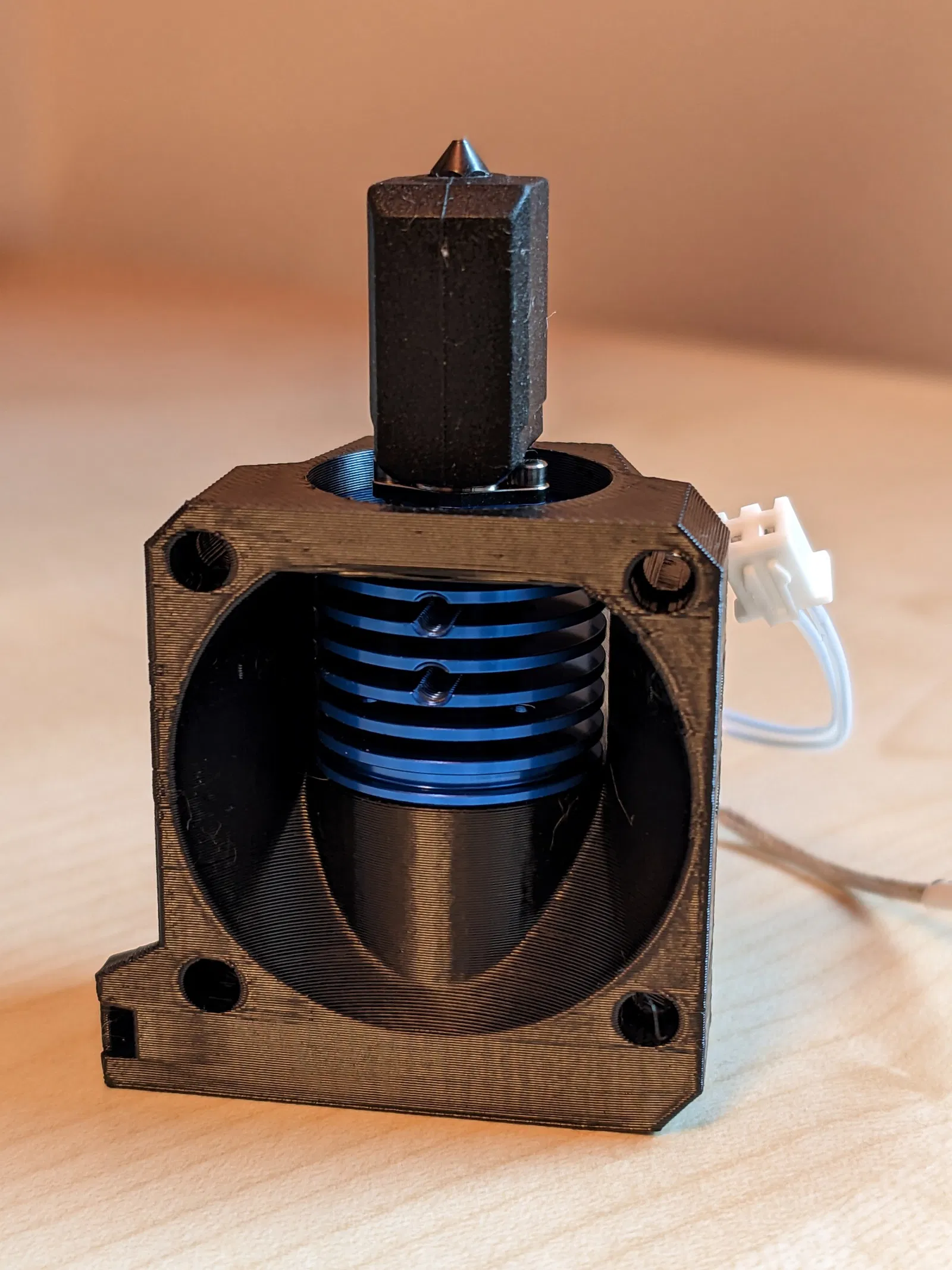 Điều này có thể gây ra các sợi tơ nhỏ trên bản in (stringing). Tôi muốn chặn luồng khí đó và đã thiết kế một ngàm mới.