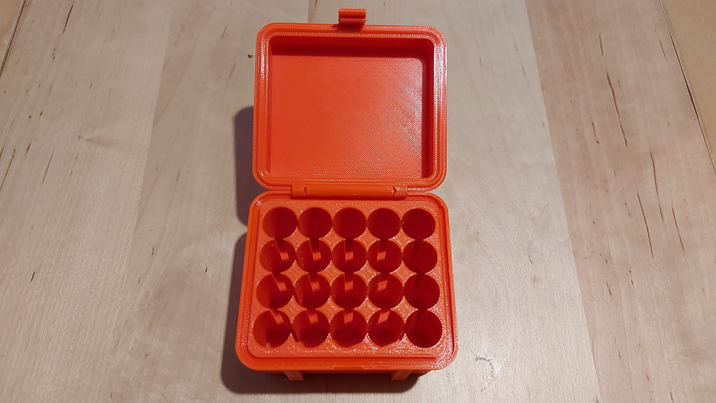Chỉnh sửa nhỏ từ mẫu Parametric Rugged Box của TheSameNameTwice (/3d-model/156948-hop-cung-cap-thong-so) Hộp này được thiết kế để đựng 20 viên pin AA / AAA. Cảm ơn vì thiết kế hộp đẹp mắt. ### Cài Đặt In Thương Hiệu Máy In: Prusa Máy In: Mk2.5s Rafts: Không Supports: Có Độ Phân Giải: 0.2 Infill: 20% Filament: Prusament PETG Cam Ghi Chú: Có thể in được mà không cần supports, mình để supports cho phần bản lề để nhìn đẹp hơn. Khuyến nghị in phần bản lề và lẫy với infill 100%. Đã đính kèm project PrusaSlicer. In bằng PETG, không chắc bản lề và lẫy bằng PLA có bền không. PETG có vẻ phù hợp cho mục đích này. Các hộp khác có sẵn tại đây: