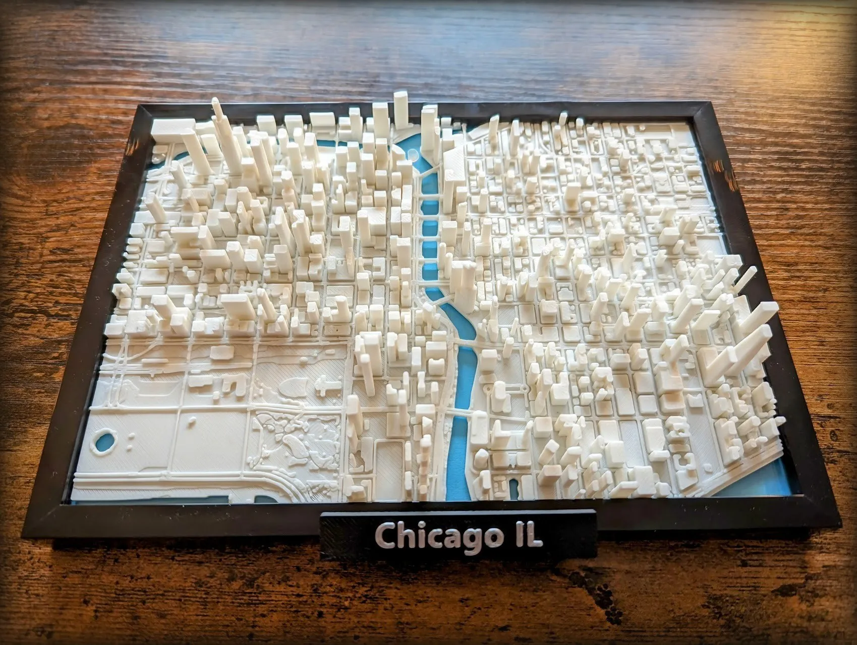 Mô hình 3D thu nhỏ của Chicago, Illinois, được tạo từ dữ liệu OSM. Xem chi tiết in ấn, gợi ý khung và các phiên bản đa sắc cập nhật. Thích hợp làm đồ trang trí tường hoặc khung.