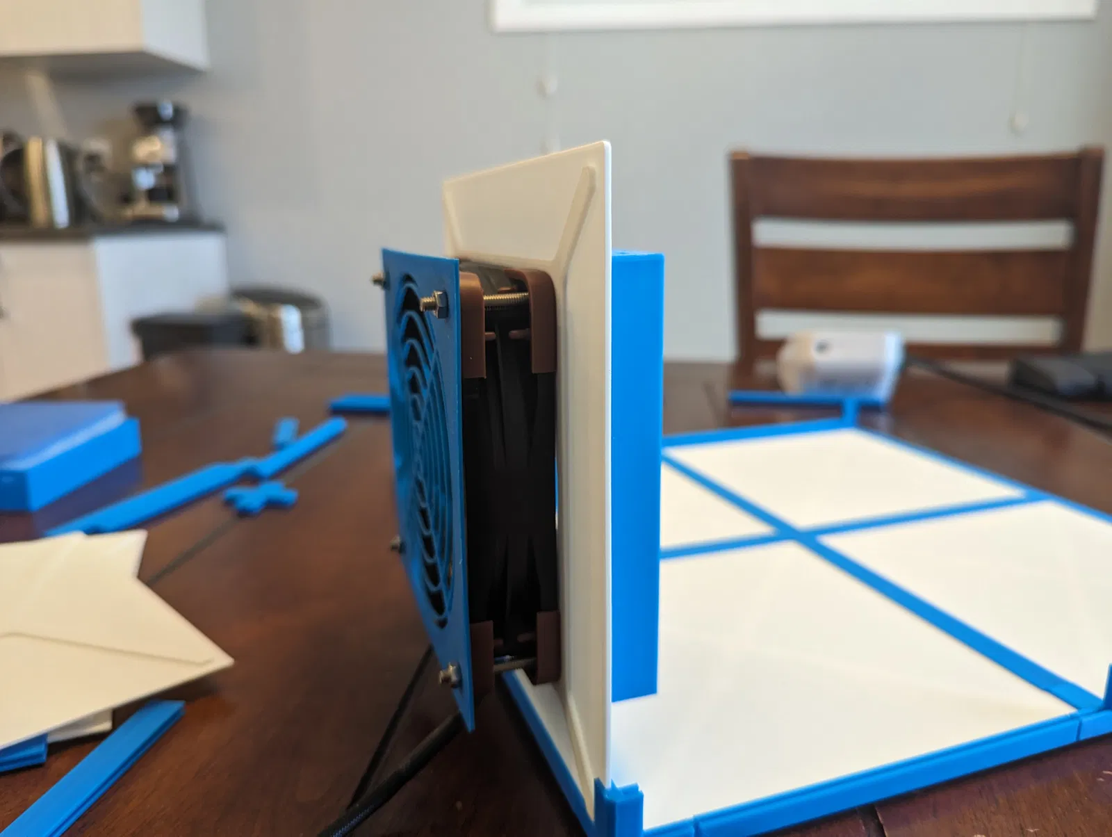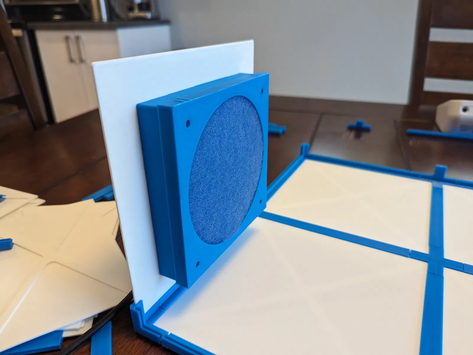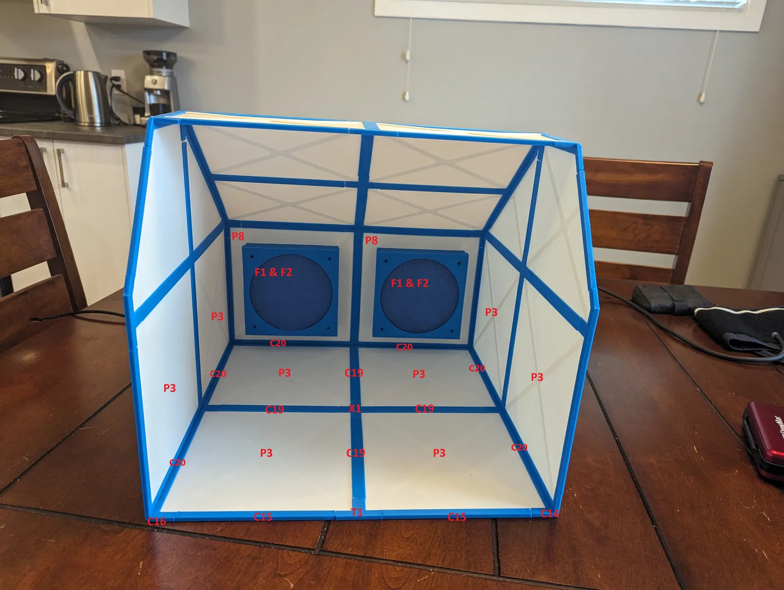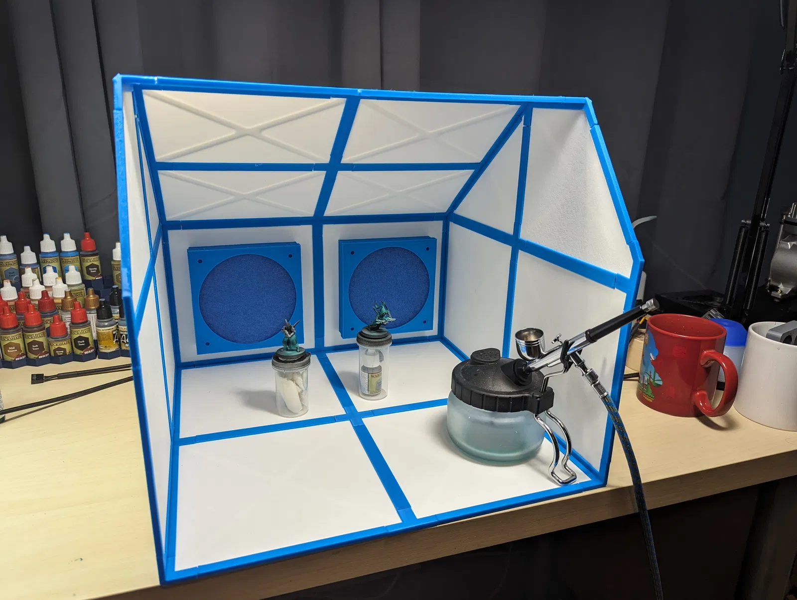 Buồng sơn cho airbrush này sử dụng 2 quạt PC 120mm áp suất tĩnh cao. Bộ lọc là loại thông thường được cắt vừa. Lắp ráp bằng keo siêu dính và hàn ma sát, hoặc có thể lắp ráp không cần keo nhưng sẽ kém chắc chắn hơn. Hướng dẫn lắp ráp có trong hình ảnh đính kèm. Tôi đã làm lại từ đầu để đơn giản hóa việc lắp ráp.