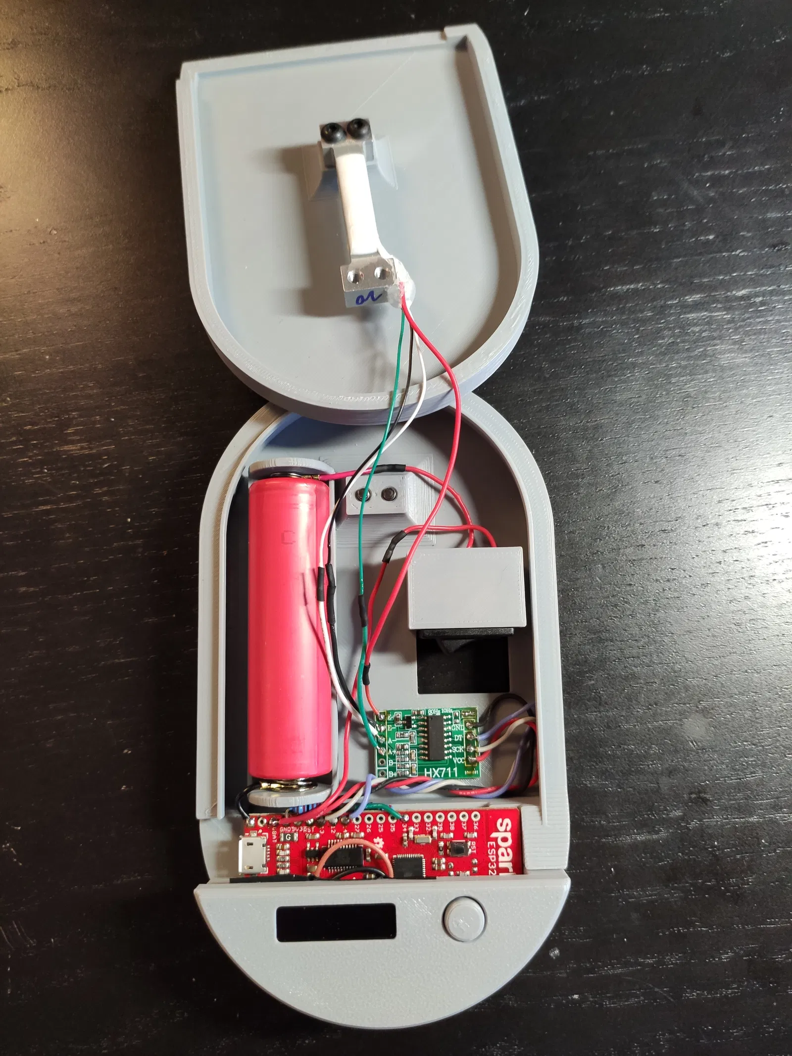 Màn hình OLED, bo mạch HX711 và ESP32 được giữ cố định bằng băng dính hai mặt loại mỏng (chỉ cần dán một ít ở hai đầu là được). Tùy độ dày của băng keo, có thể bạn phải mài nút bấm cho nó bớt nhô cao lên khi ở vị trí nghỉ.