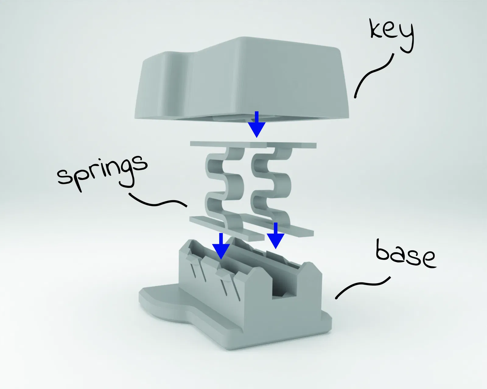 - Phần đế và keycaps có thể in bằng PLA. Khuyến khích in lò xo bằng PETG vì vật liệu này dẻo hơn PLA.