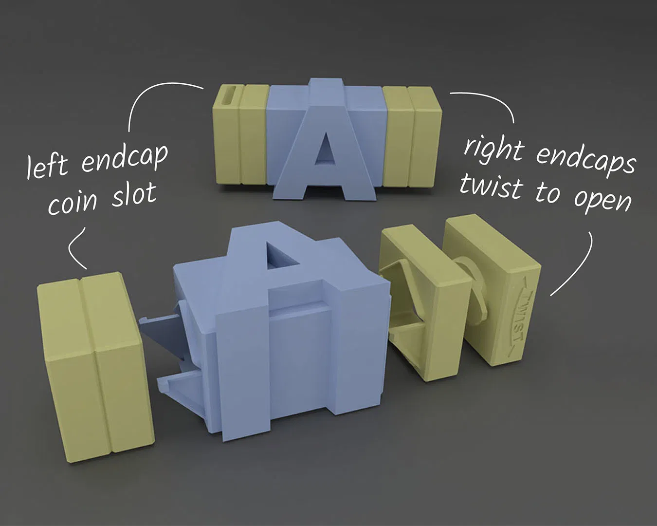Letterbank là một heo đất tùy chỉnh được làm từ các chữ cái! In các chữ cái cần thiết, kết nối chúng lại bằng nắp cuối để tạo heo đất cá nhân hóa. Nắp bên trái có khe cắm tiền xu, nắp bên phải có thể mở để lấy tiền ra.
