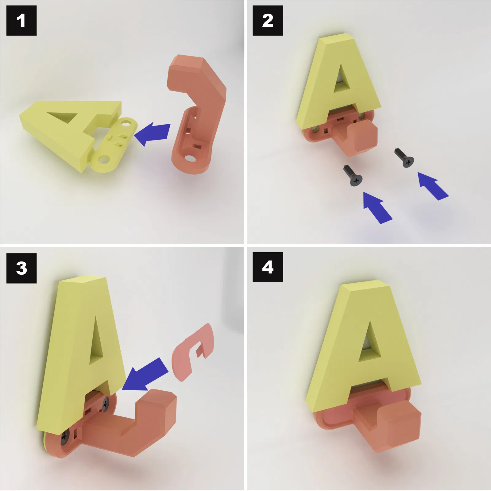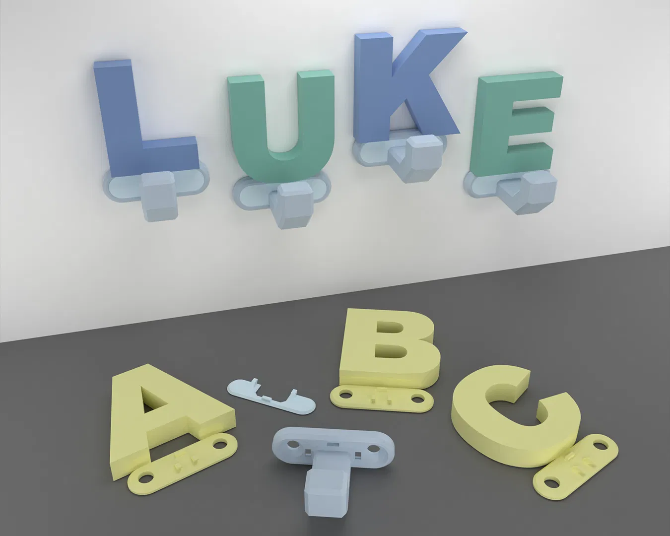 Các chữ cái có thể in riêng lẻ rồi gắn vào móc. Sau đó, các bộ phận có thể được gắn lên tường bằng ốc vít. Nắp che có thể được gắn vào sau để giấu ốc vít và có một vẻ ngoài gọn gàng. Tôi khuyên bạn nên treo các chữ cái ở các độ cao khác nhau để tạo vẻ ngoài sinh động.