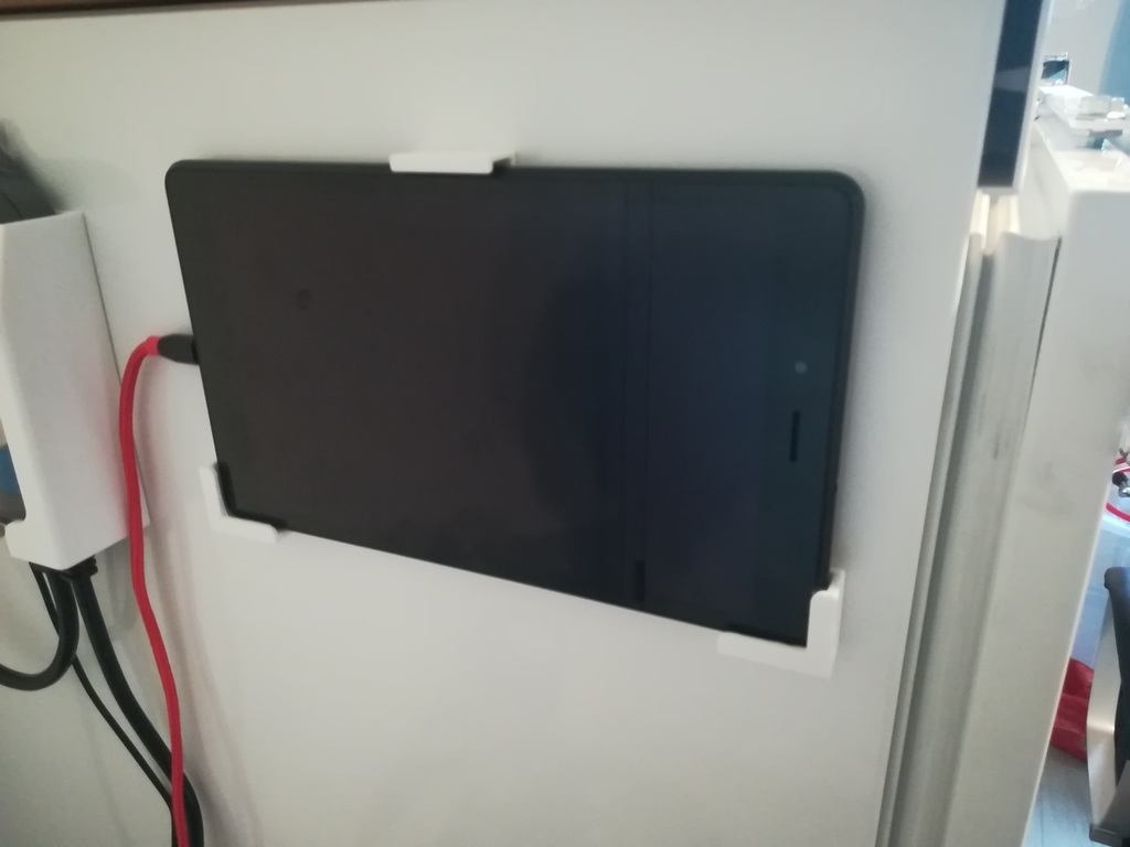 Giá treo tường đơn giản cho Samsung Galaxy Tab A 8''. Tôi đã dán nó lên tủ lạnh bằng băng dính hai mặt.