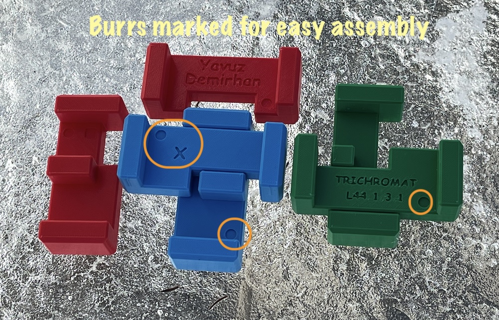 Trichromat, câu đố lồng burr tuyệt vời của Yavuz Demirhan, dễ in, dễ lắp ráp lại mà không cần lời giải. Độ khó trung bình, ổn định, đòi hỏi hơn 40 bước để mở. Hoàn hảo cho người thích thử thách và khám phá cơ chế.