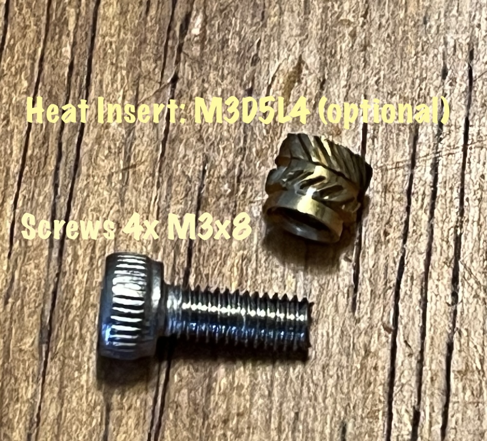 Bốn chèn nhiệt (tùy chọn) là M3D5L4 (xem hình trên). Có một phiên bản đáy khung nơi bạn có thể vặn trực tiếp vít M3 vào đáy nhựa.