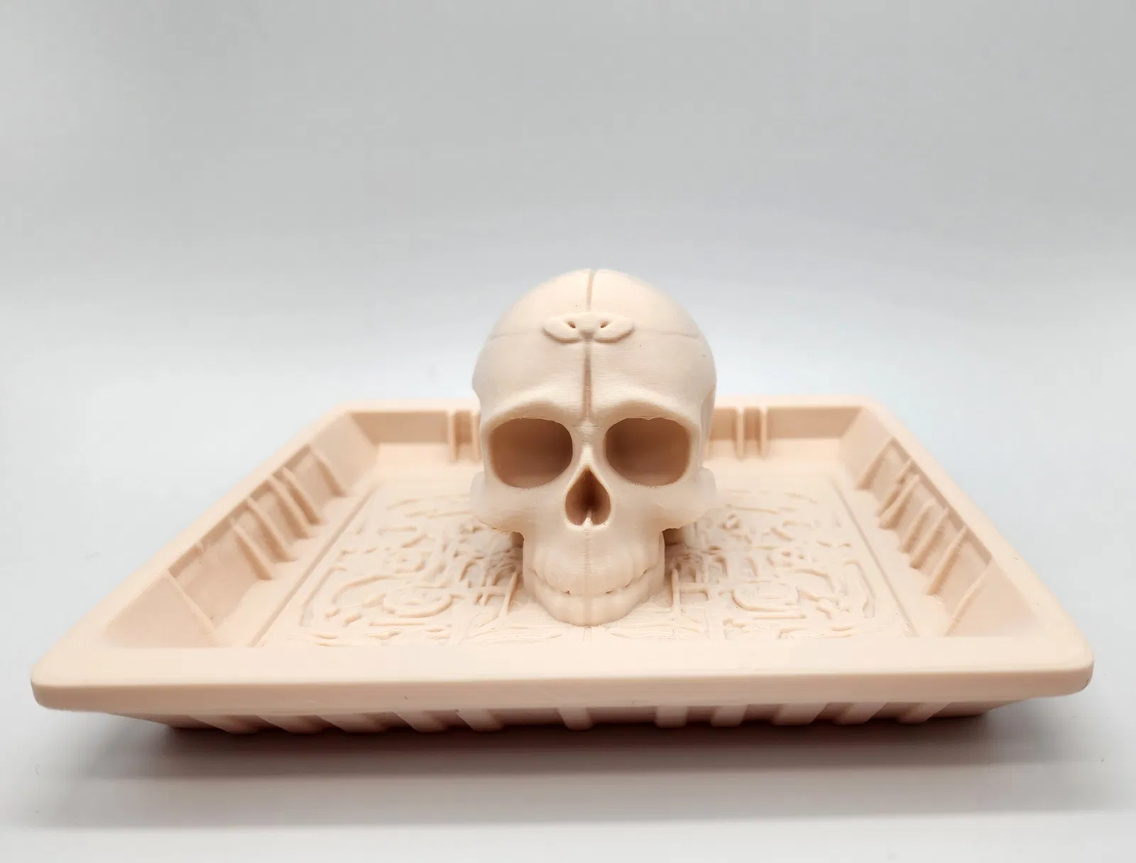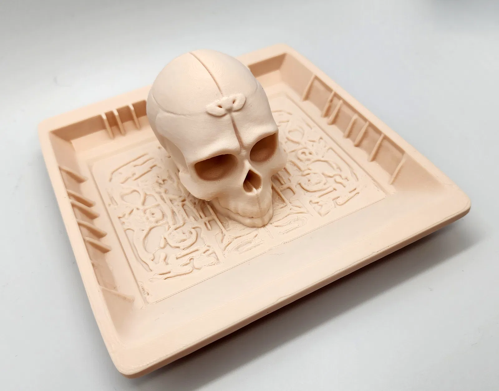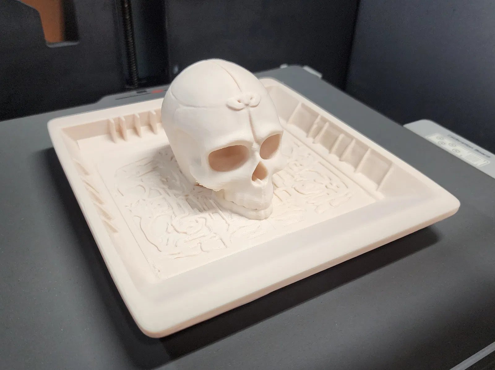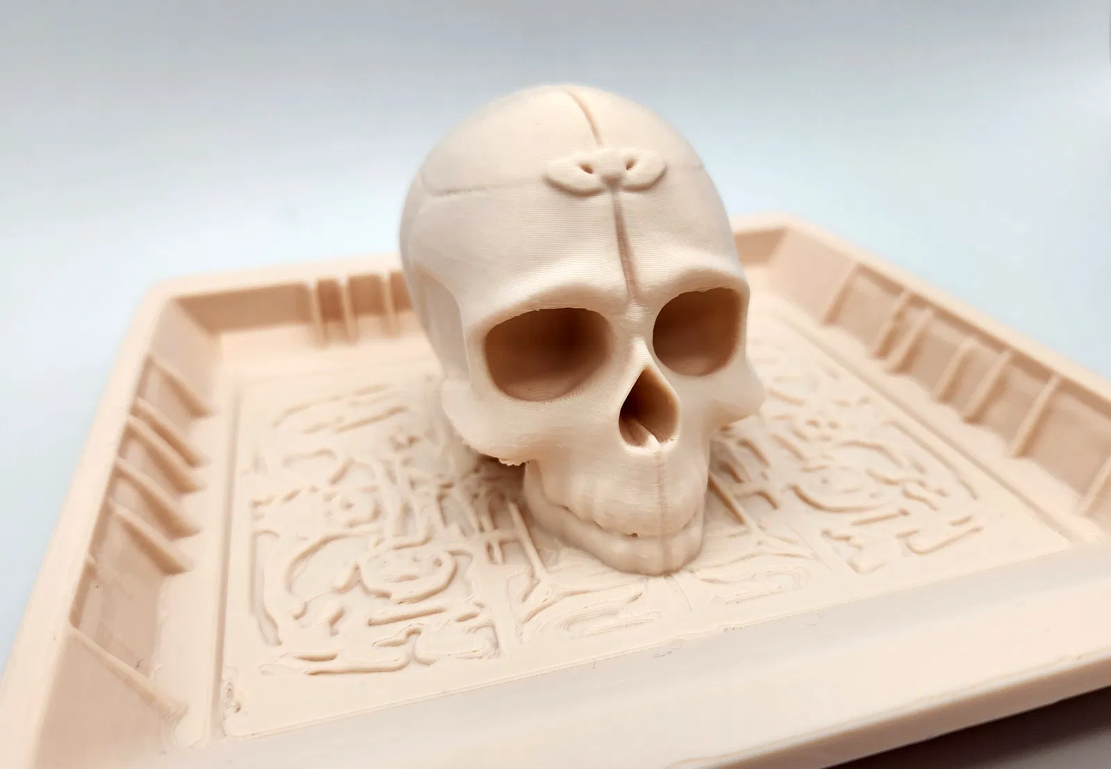 Món đồ này in không cần supports nha, nhưng bạn nào muốn in cho chắc thì cứ xài. Đây là khay đựng đồ hình đầu lâu, cực hợp cho dịp Halloween hoặc để trang trí bàn làm việc, đựng chìa khóa, vật dụng nhỏ.