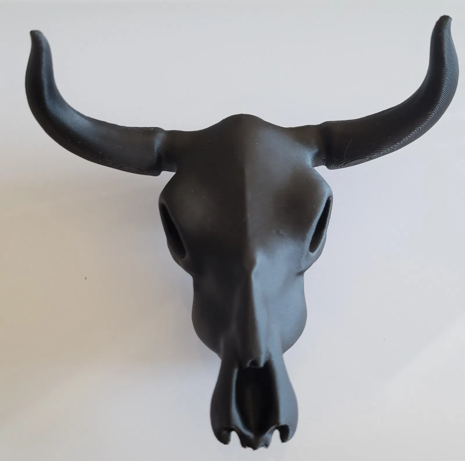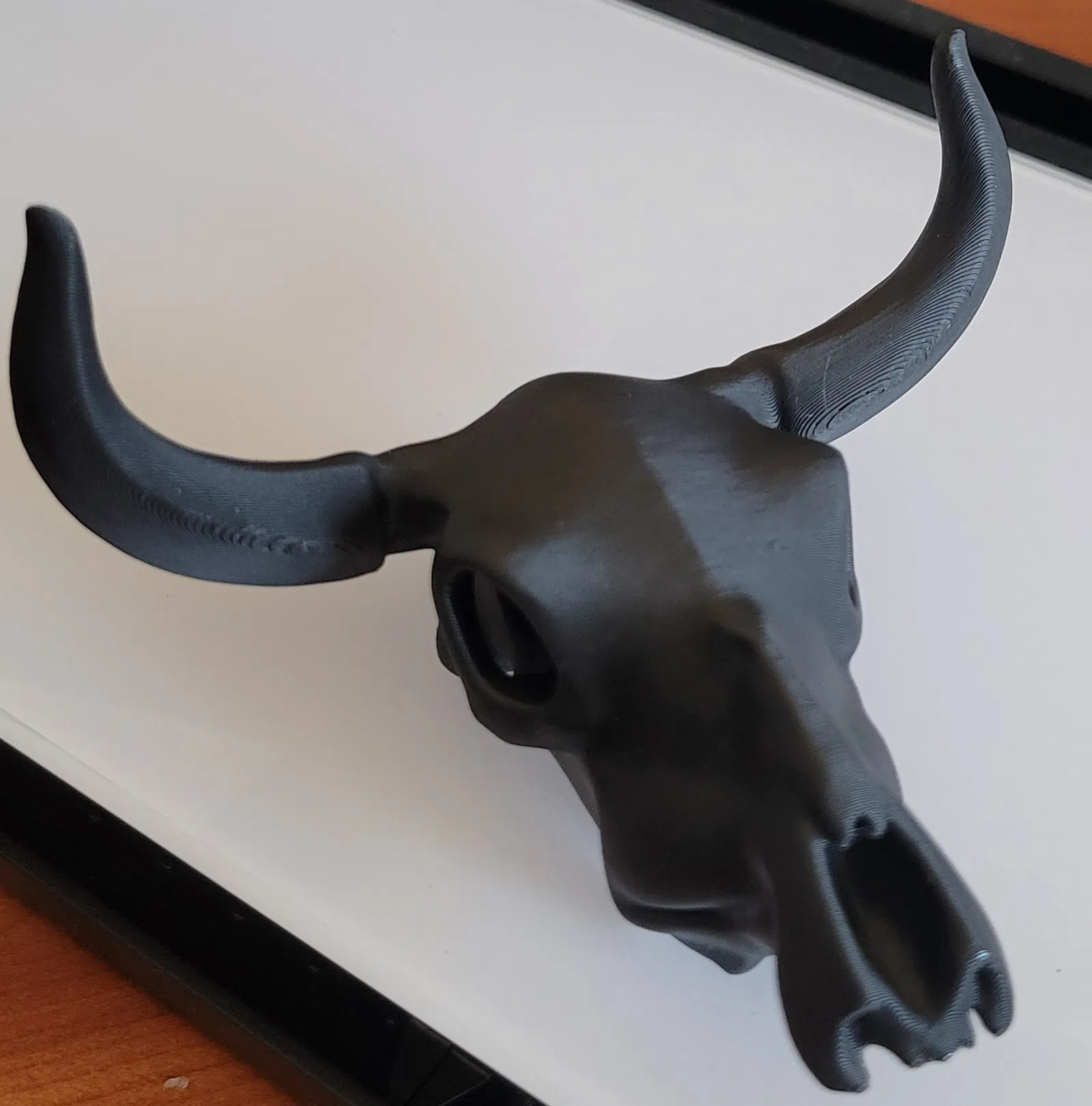 Đầu lâu bò…chả có gì nói thêm đâu. Nó scale ngon lành cành đào luôn. Bản in trong hình là màu Bambu Black PLA matte, kích thước khoảng 75mm D x 70mm C x 92mm R.