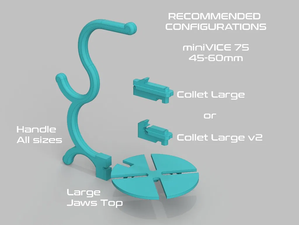 Phiên bản này có 4 hàm kẹp cho phép hỗ trợ cả đế tròn và vuông trong một dụng cụ giữ. Ngoài ra, bạn không còn cần các chốt kim loại của phiên bản trước. Tuy nhiên, nó chỉ khó in hơn một chút, tôi phải sử dụng rafts để in các collet/hàm kẹp. Nó sử dụng dây thun 70mm. Bạn có thể thử dùng dây buộc tóc xem sao.