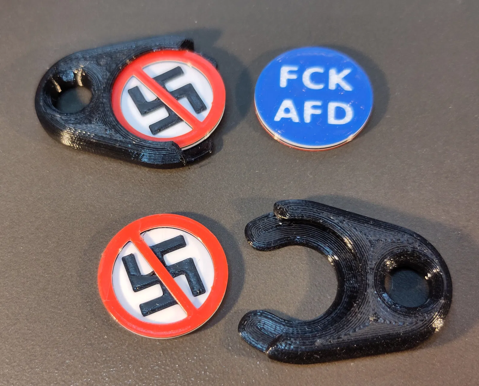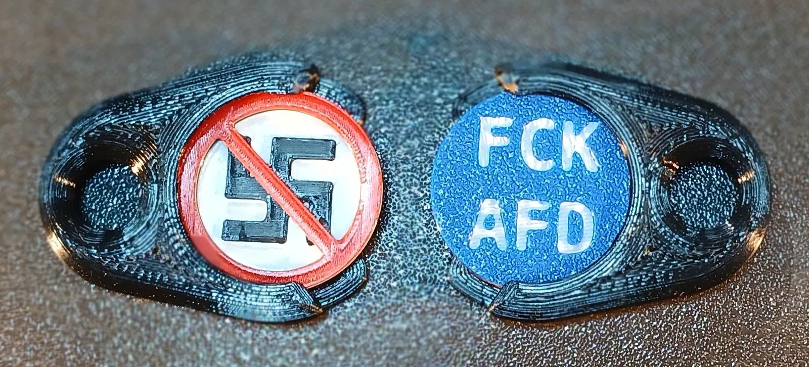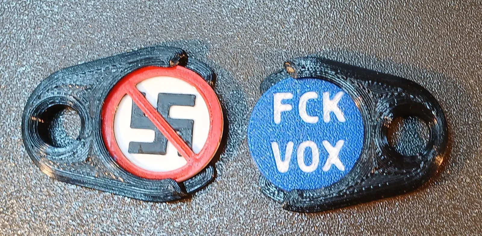 Con chip giỏ hàng Euro được làm lại bằng OpenSCAD để in tối ưu hơn. Chữ "FCKAFD" được thêm bằng PrusaSlicer. Bản cập nhật mới đã bổ sung thêm chữ "FCK VOX" và sửa lỗi.".