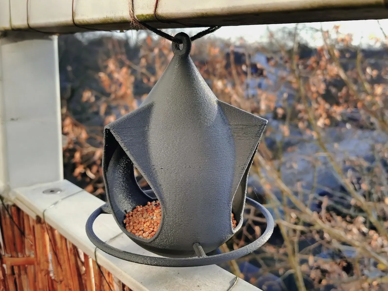Máng ăn cho chim hình giọt nước, dễ in bằng công nghệ 3D. Thiết kế thông minh giúp thoát nước khi trời mưa, tránh đọng nước và giữ thức ăn khô ráo cho chim. Phù hợp cho các loài chim nhỏ.