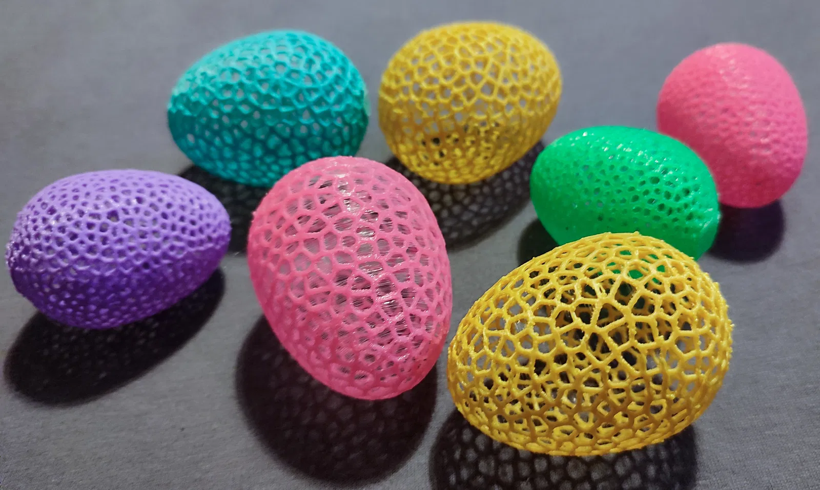 Mô hình trứng Phục Sinh theo phong cách Voronoi, in bằng PLA trên máy Creality K1 Max. Không cần support, khuyến khích dùng keo dán hoặc brim để có độ bám tốt nhất.