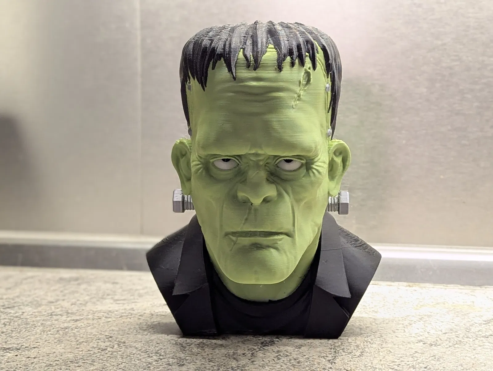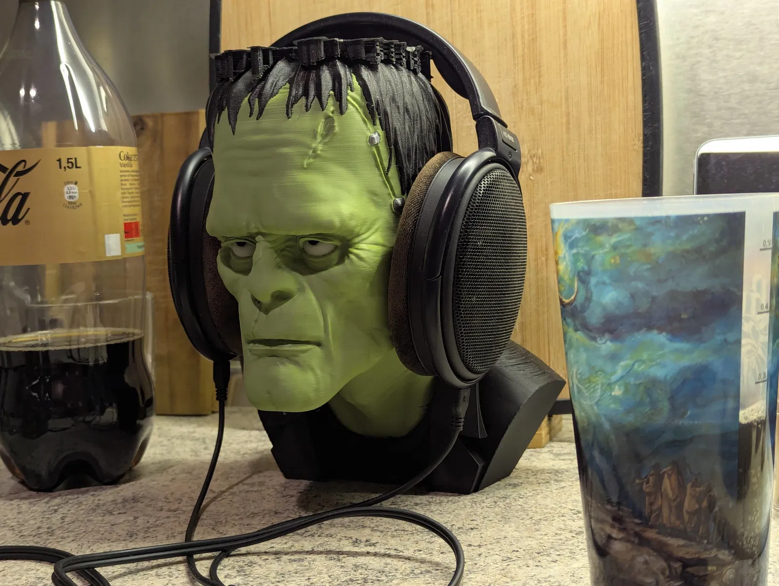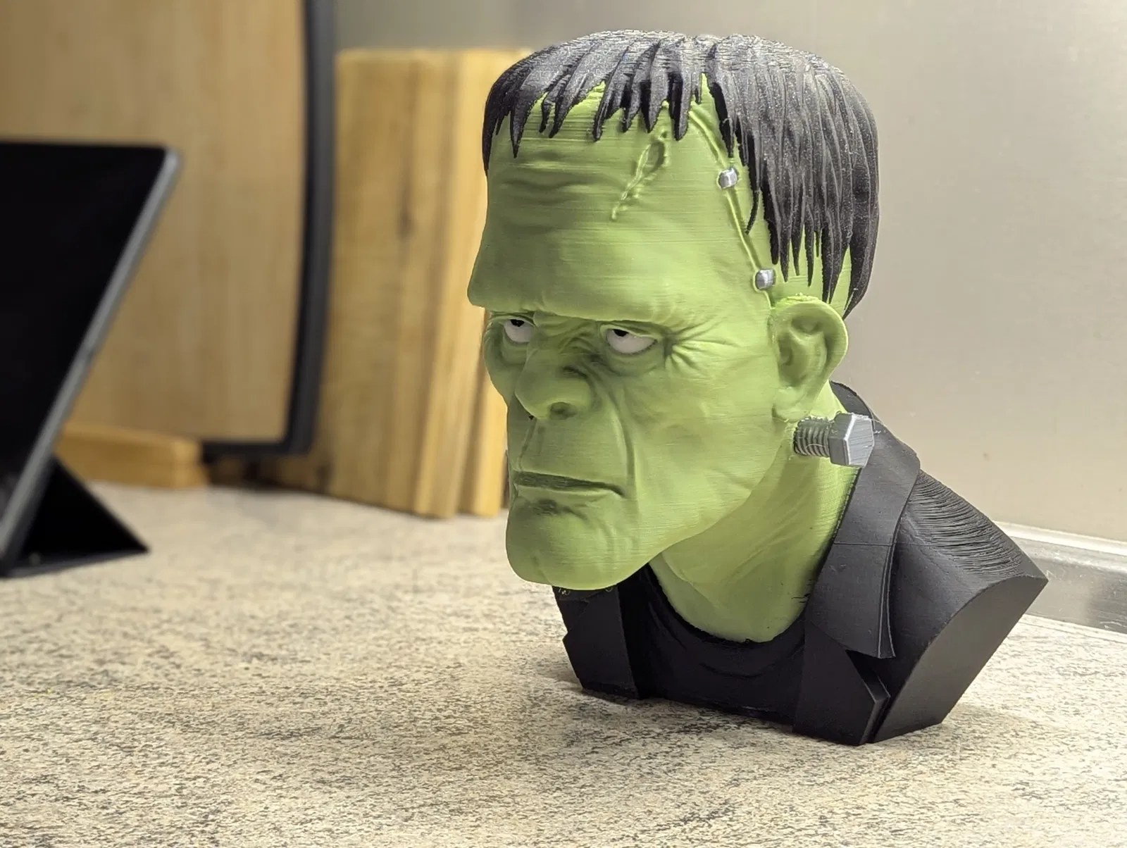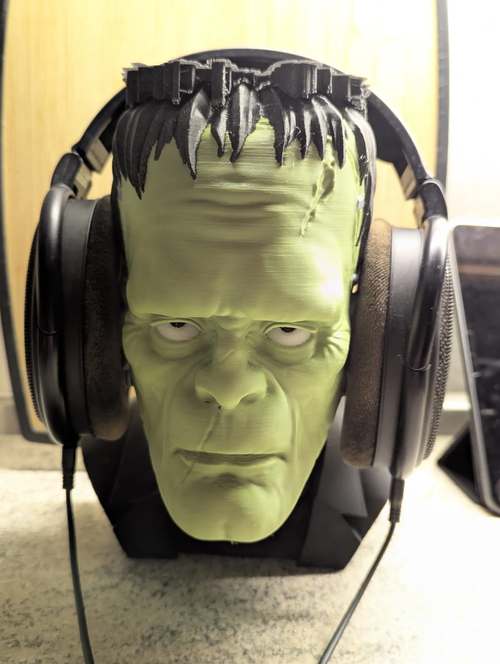 Mẫu tượng bán thân Frankenstein được tùy chỉnh để làm giá đỡ tai nghe. Mẫu này yêu cầu kỹ năng in nâng cao và có thể cần thêm vật liệu để giữ thăng bằng. Kết quả rất ấn tượng nếu bạn có thể xử lý được.