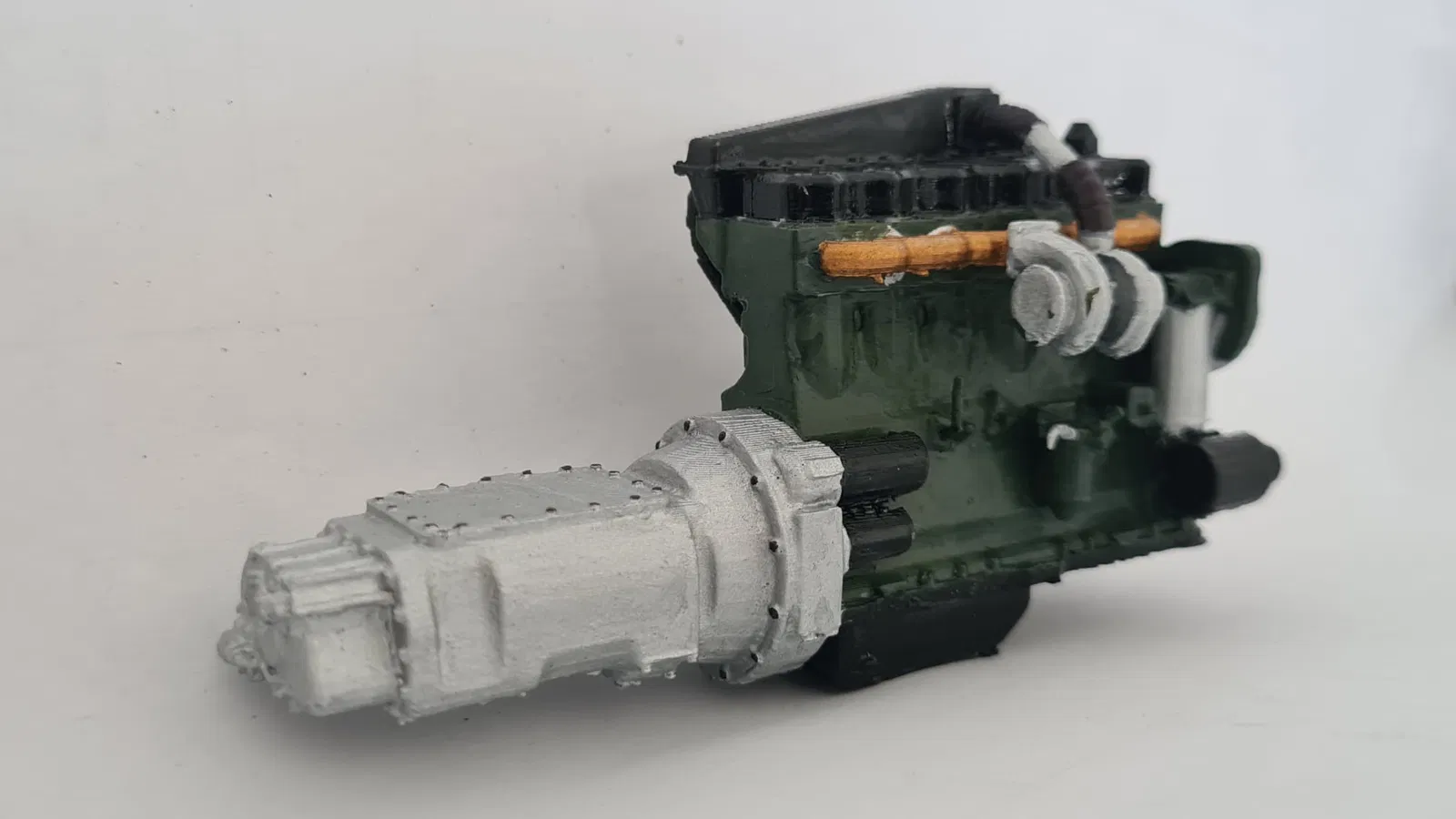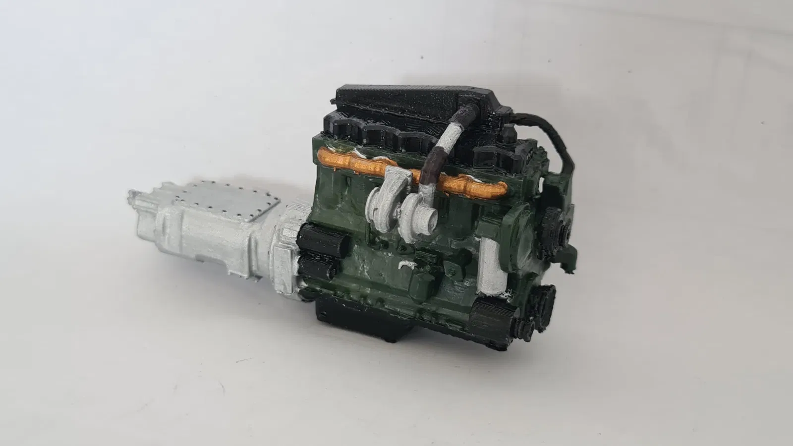 Nó in được một màu và bạn có thể sơn để có vẻ ngoài chân thực hơn. Trong trường hợp của tôi, tôi đã dùng Tamiya XF-16 và X-18 cho hộp số, bộ tăng áp và các bộ phận nhấn nhá, cùng với màu xanh lá cây và màu gỉ sét enamel của Revell 363 (tôi không biết mã) cho khối động cơ và cổ hút. Trong Beamng Drive, động cơ được sơn gần như toàn bộ màu đỏ với các chi tiết nhấn nhá màu đen.