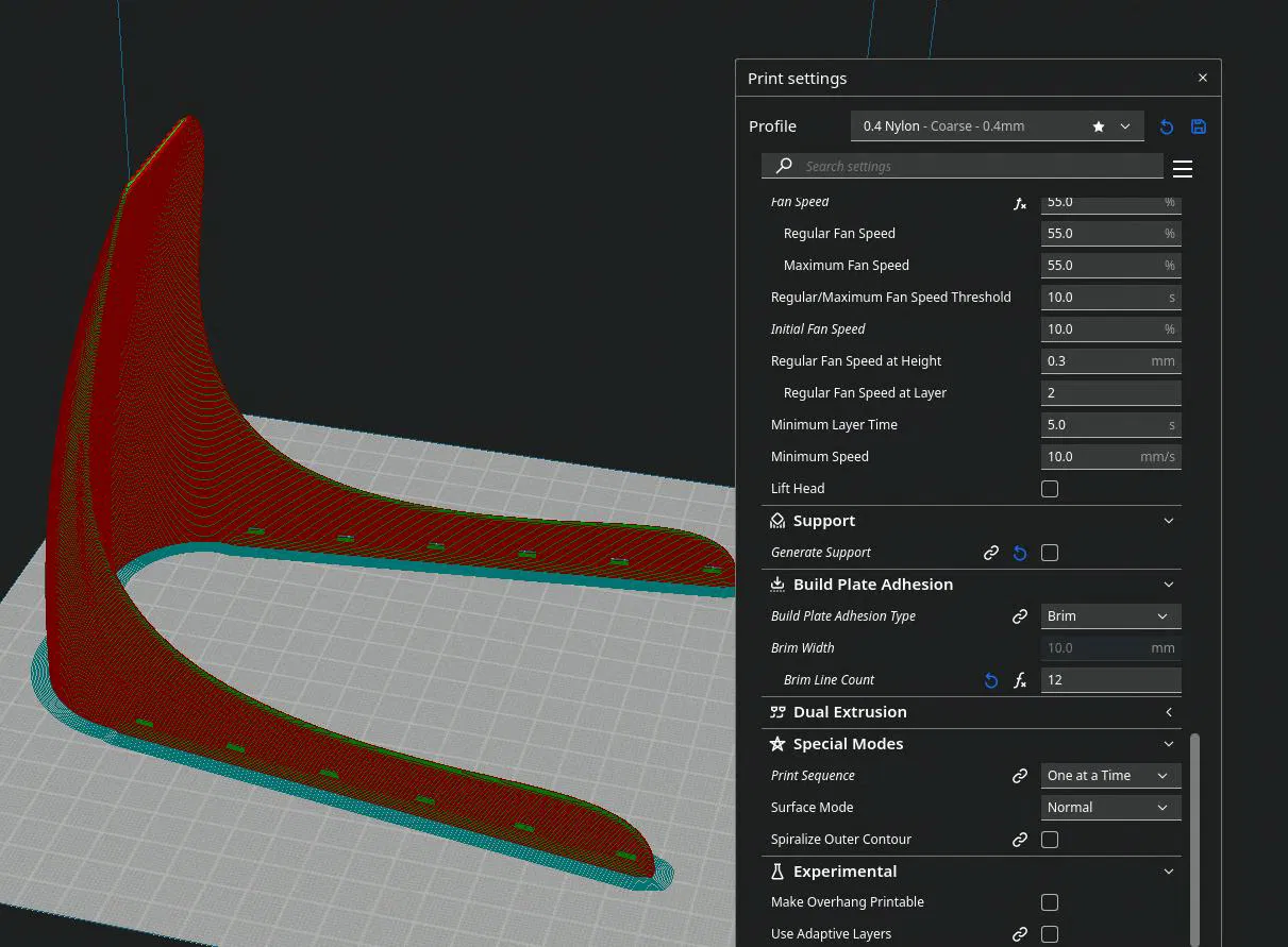Ban đầu tui in bằng nhựa PCTG, mà đi được khoảng 6 tháng thì nó bị nứt dọc theo các lớp in. Sau đó tui in bằng nhựa Nylon, giờ thì cứng cáp hơn nhiều.