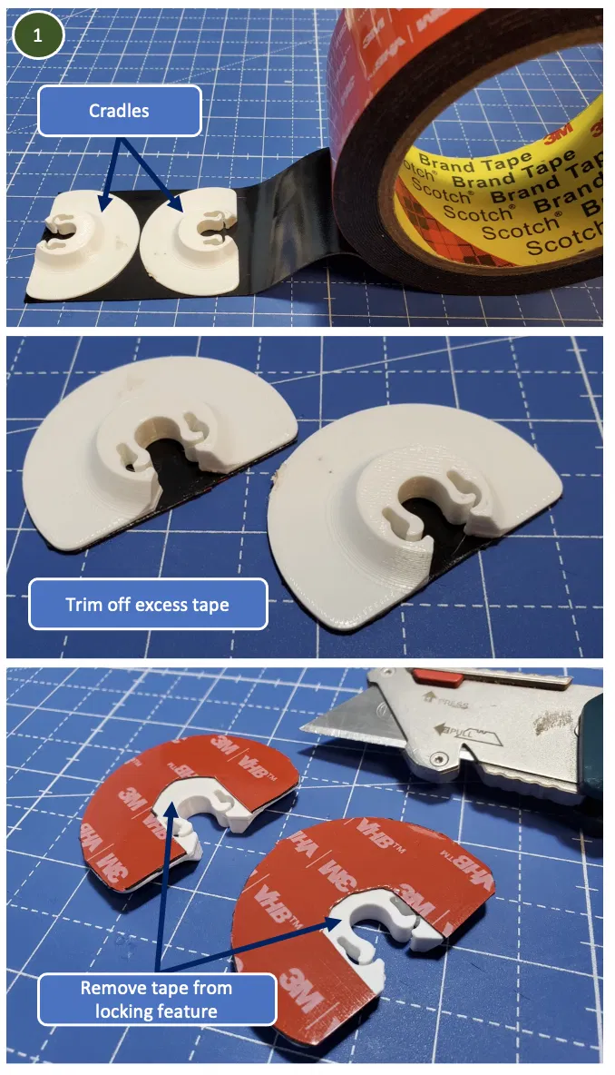 - Đầu tiên, bạn cần dán băng keo vào mặt sau của giá đỡ. Sau đó, cắt bỏ phần thừa và bóc băng keo quanh bộ phận khóa trục.