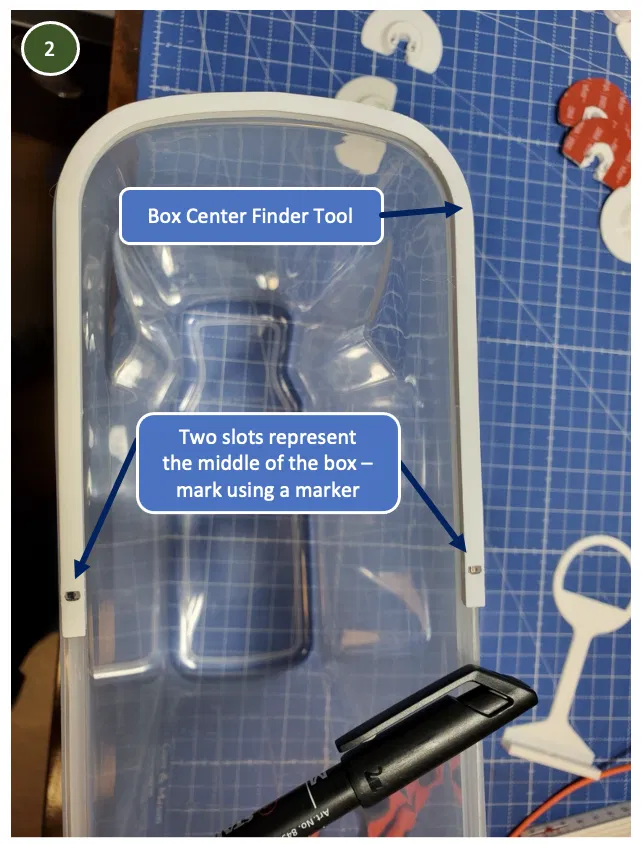 - Công cụ _Box_CenterFinder_ có thể đặt lên trên hộp musli và sẽ cho bạn biết tâm chính xác của hộp. Dùng bút dạ đánh dấu qua khe của dụng cụ định hướng. Mặt trên có tính đối xứng, nên không quan trọng bạn dùng bên nào.