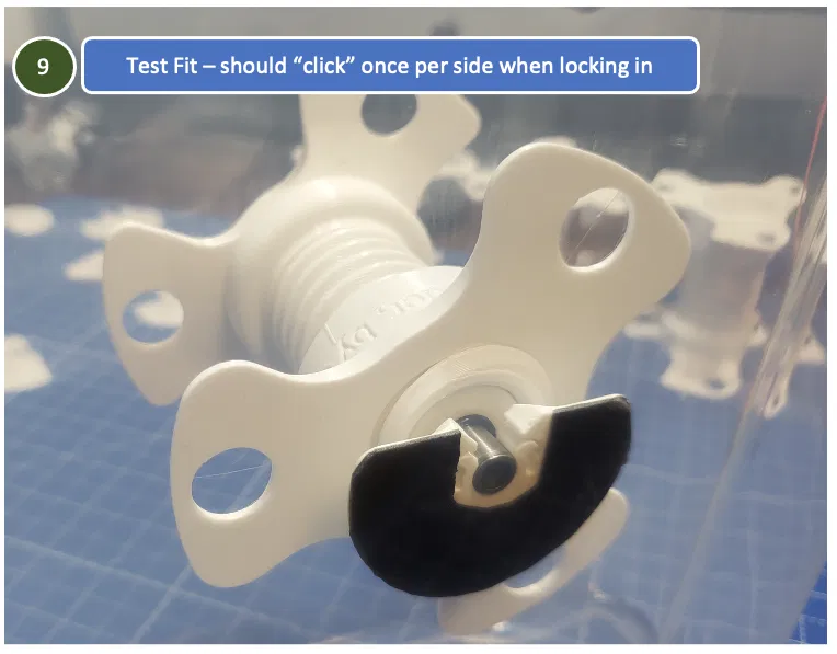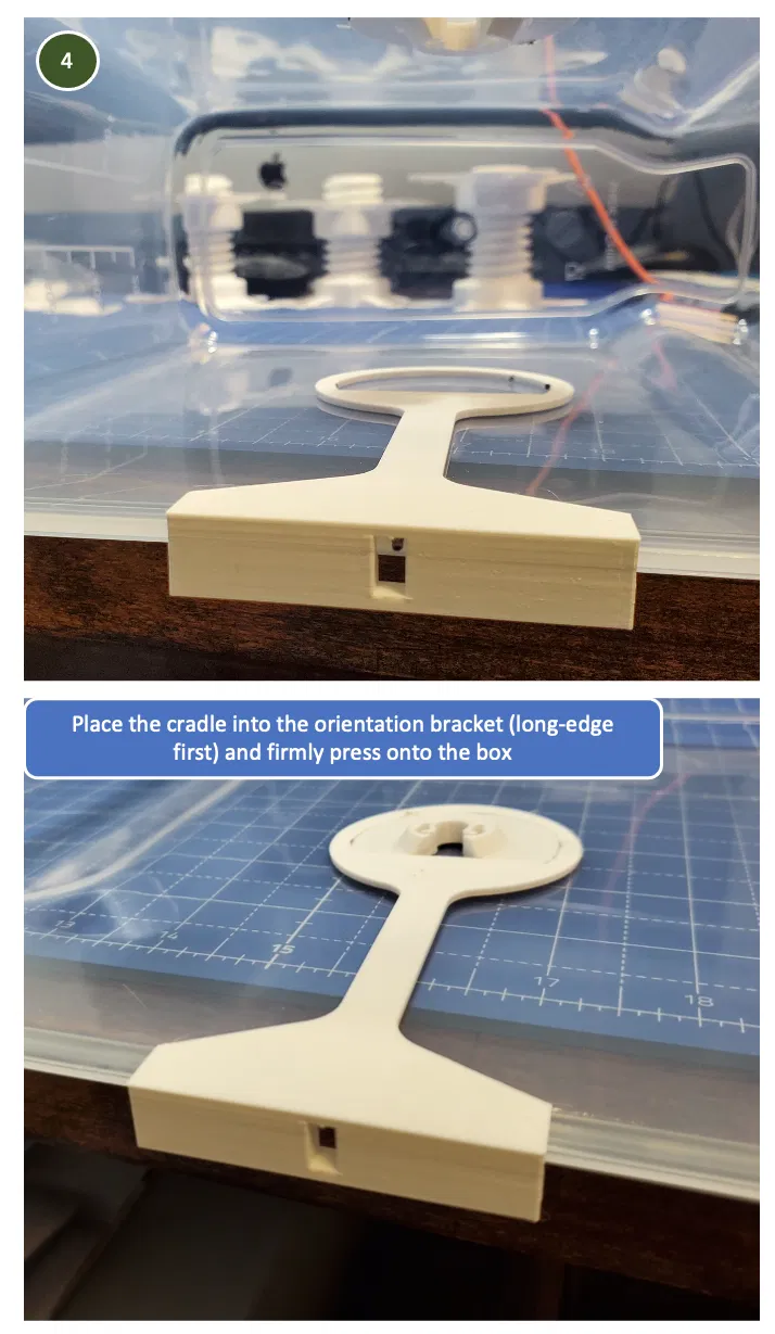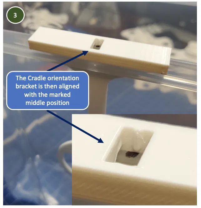 - Sau đó, căn chỉnh khe trên _Cradle_OrientationBracket_ với dấu bạn vừa tạo. Bạn có thể cố định tạm thời giá đỡ bằng băng keo nếu cần.
