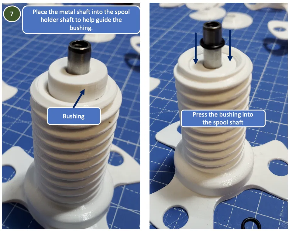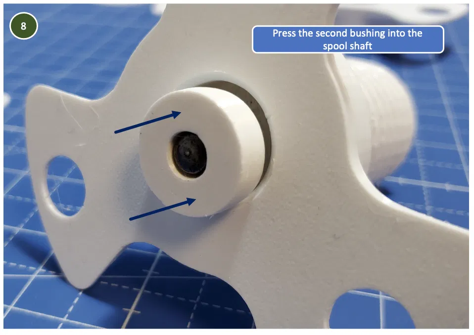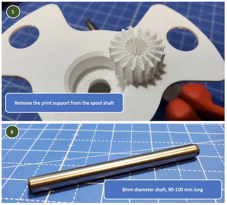 Sau một thời gian sử dụng các trục in 3D hoàn toàn, tôi đi đến kết luận rằng chúng bị biến dạng theo thời gian và gây ra quá nhiều vấn đề. Bằng cách sử dụng trục kim loại, bạn giảm được kích thước tổng thể (và cho phép sử dụng spool rộng hơn), tăng tuổi thọ và quan trọng nhất là không cần dùng bạc đạn (bearing) nữa. Do hệ số ma sát thấp giữa trục kim loại và bạc lót in 3D, bạc đạn trở nên không cần thiết.
