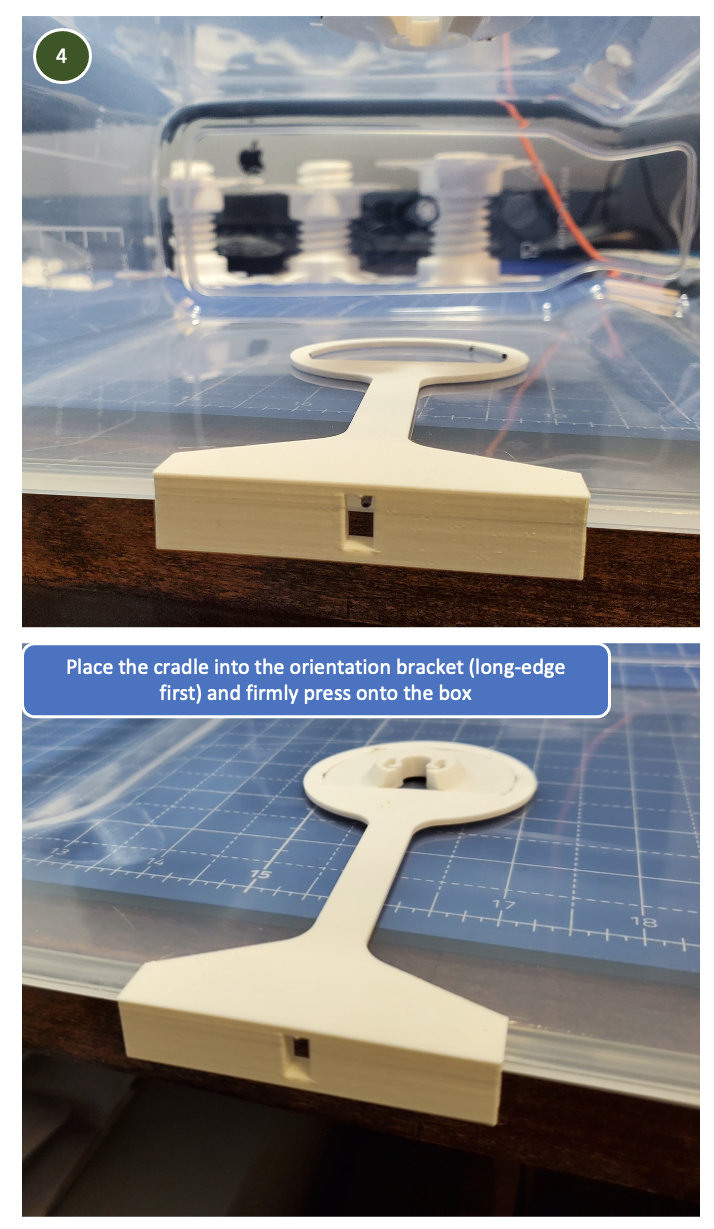 - Đặt giá đỡ vào bộ định hướng (lấy cạnh dài làm thước đo) và ấn chặt vào hộp.