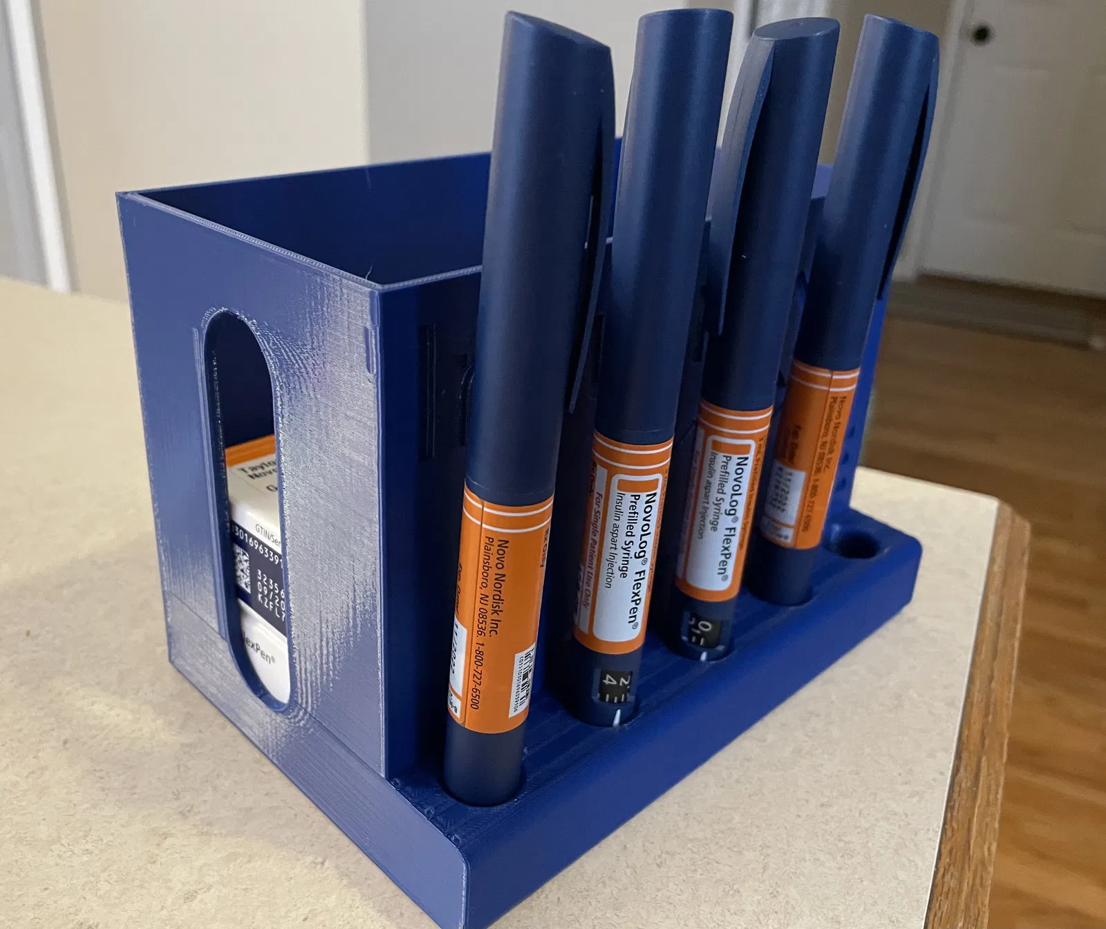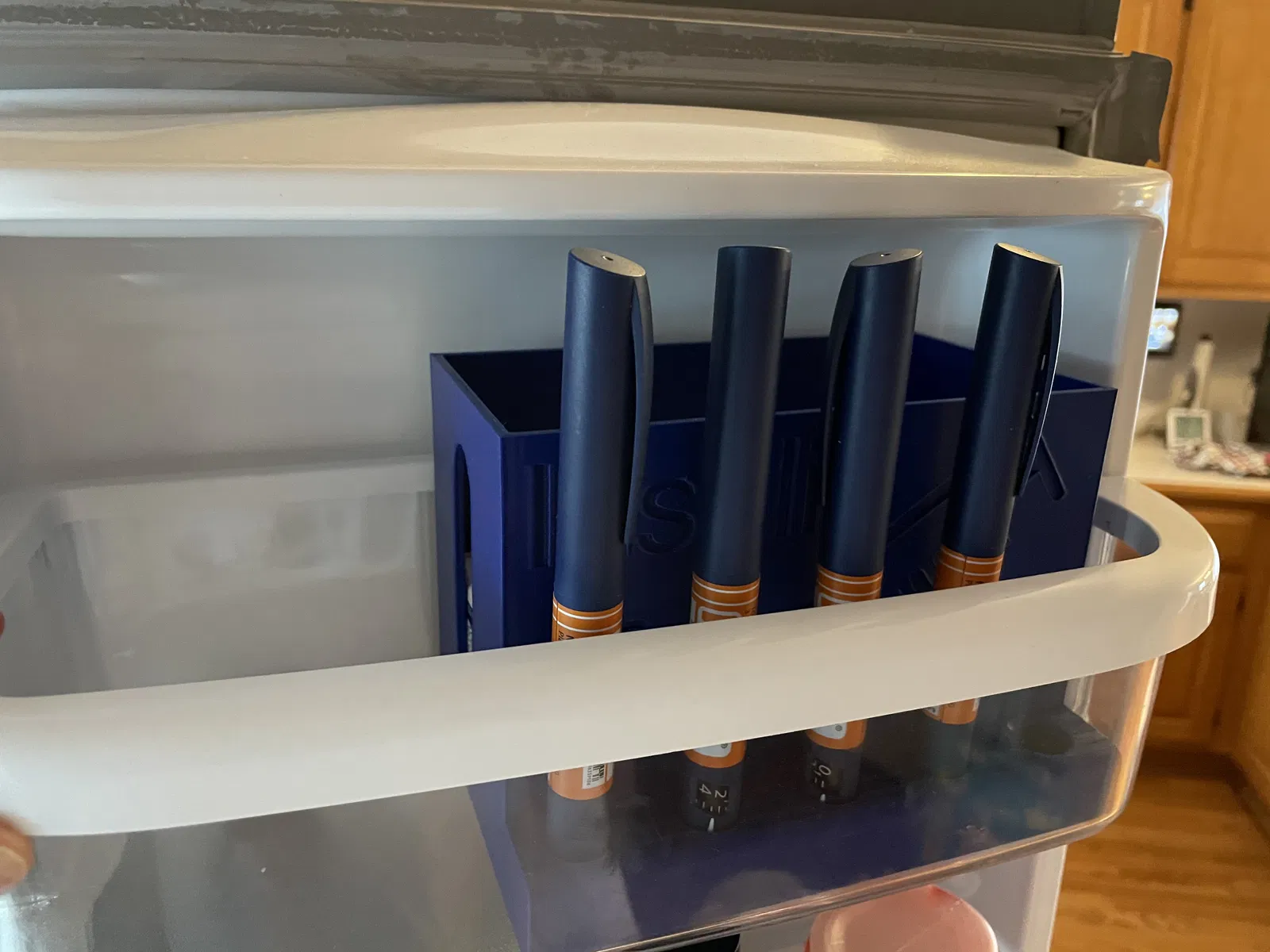 Tôi đã thiết kế một bộ tổ chức có các khe ở hai đầu để tôi có thể dễ dàng lấy một hộp bút tiêm insulin mới khi cần mở, nhưng bộ tổ chức được thiết kế đủ cao để chứa 4 hộp bút tiêm chưa mở và 5 lỗ ở phía trước để lưu trữ theo chiều dọc 5 cây bút tiêm từ hộp tôi đang sử dụng. Điều này cho phép bạn dễ dàng lưu trữ tổng cộng 5 hộp bút tiêm insulin (25 cây bút tiêm) mà không bị trượt lung tung hoặc rơi ra khỏi ngăn tủ lạnh!