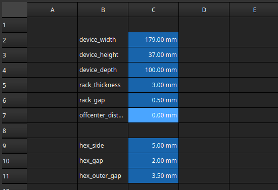 - rack_gap: khoảng trống thêm vào chiều rộng, chiều cao và chiều sâu của thiết bị. Tui thấy 0.5mm là đủ để có khoảng trống mà không bị lỏng lẻo.