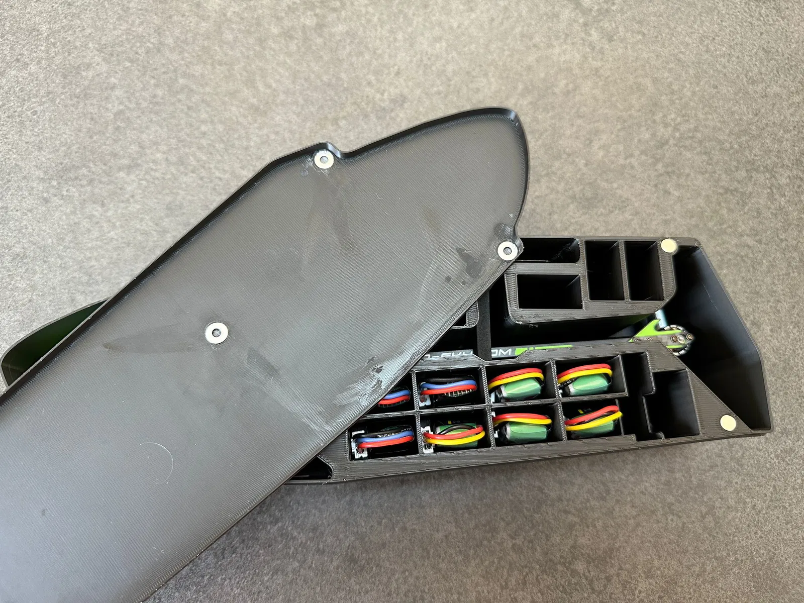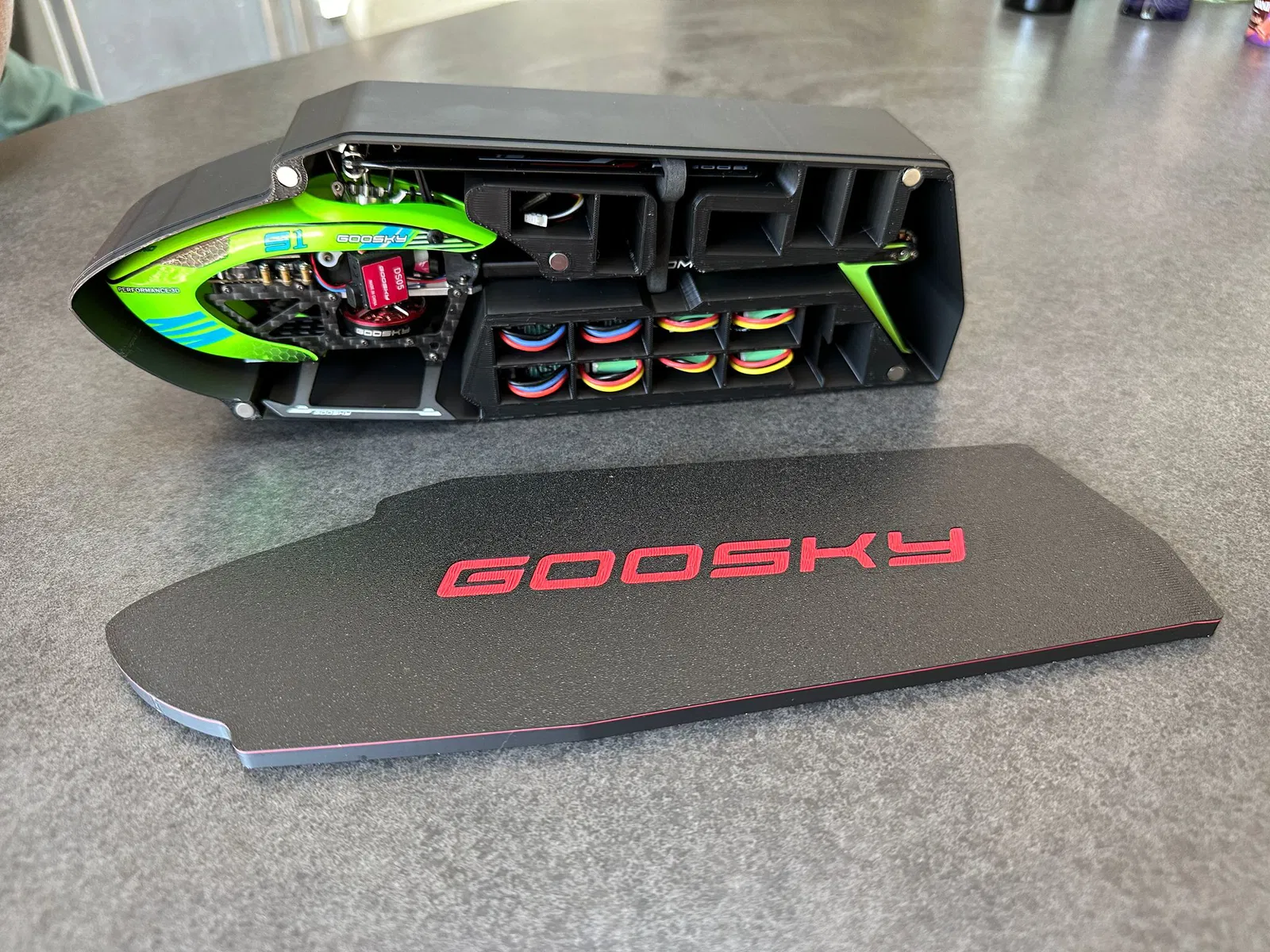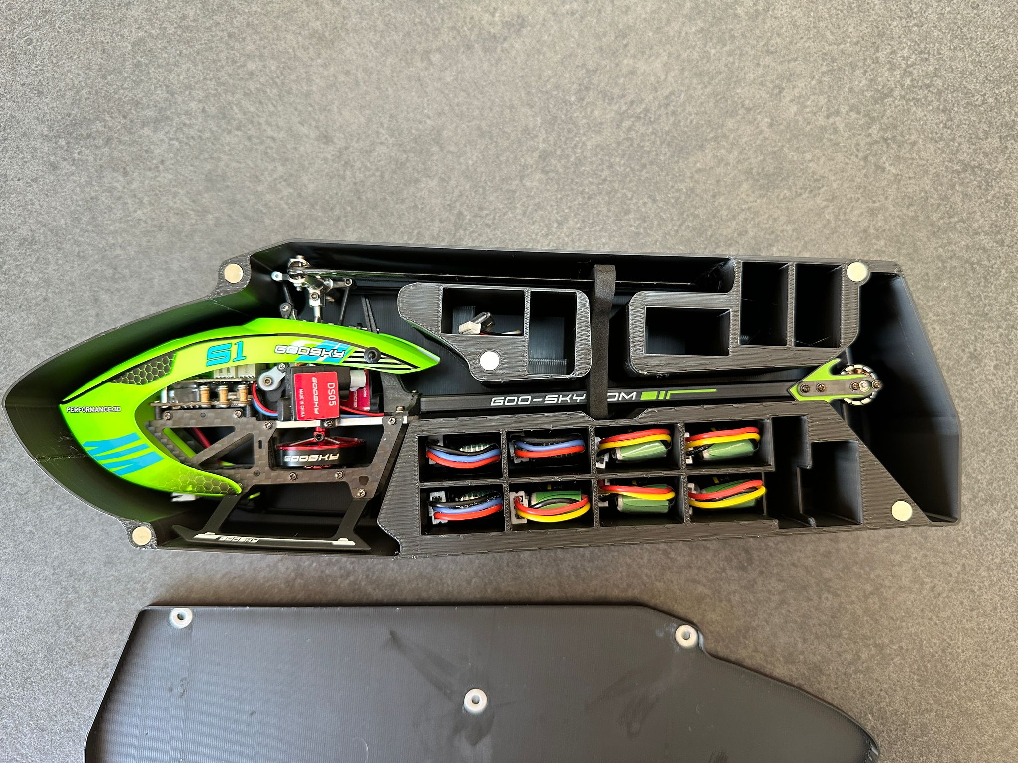 Đây là cái hộp được tối ưu cho trực thăng Goosky S1 để nhỏ hơn phiên bản hộp xốp gốc, và có thể chứa được tới 14 pin.