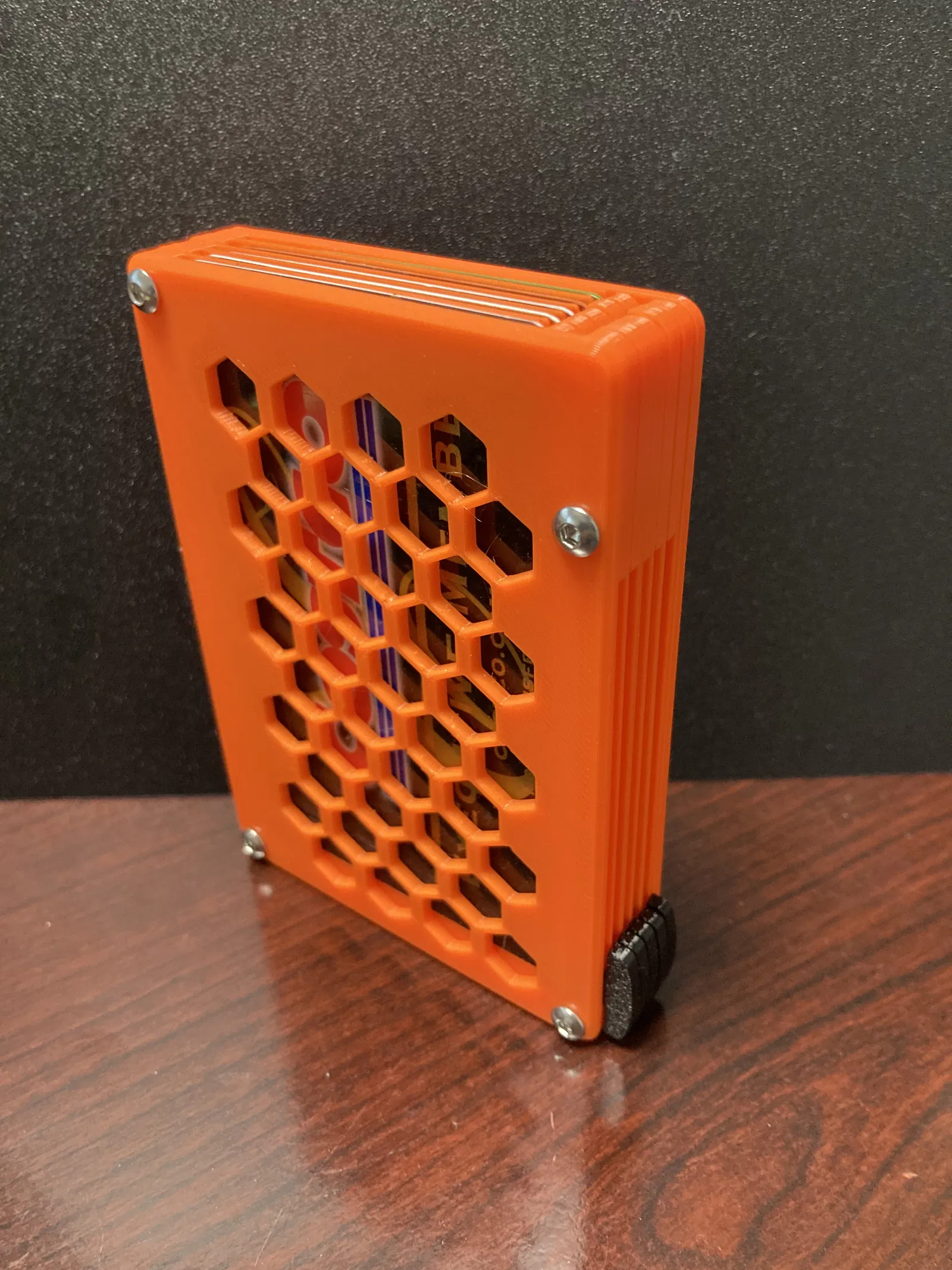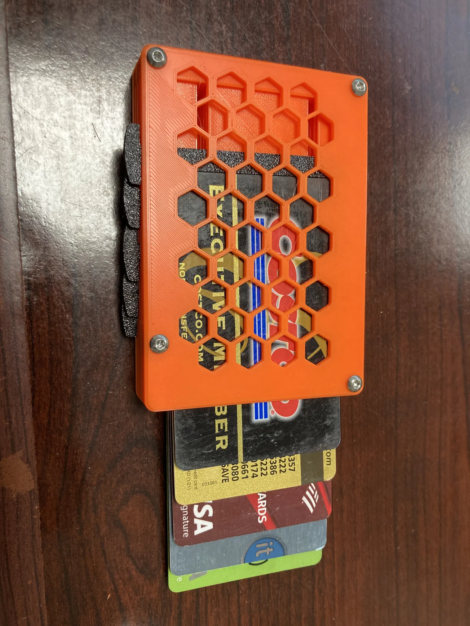 Đây là một ví đựng thẻ có kích thước vừa với các thẻ tiêu chuẩn (tiêu chuẩn, như được định nghĩa bởi kích thước ISO/IEC 7810 ID-1). Ví có thể chứa bất kỳ số lượng thẻ nào bạn muốn, miễn là bạn tìm được bu lông M3 đủ dài để sử dụng. Ví giữ thẻ chắc chắn để chúng không bị rơi ra nếu bạn cầm ví lộn ngược và các thanh trượt bên cho phép bạn dễ dàng lấy một thẻ cụ thể. Tính chất mô-đun của ví cho phép bạn tùy chỉnh: nếu bạn muốn các thanh trượt có màu khác nhau để mã hóa màu thẻ của mình, bạn có thể làm như vậy; nếu bạn muốn đặt một thiết kế tùy chỉnh ở mặt trước (hoặc mặt sau) của bìa, bạn có thể sửa đổi thiết kế để làm như vậy.