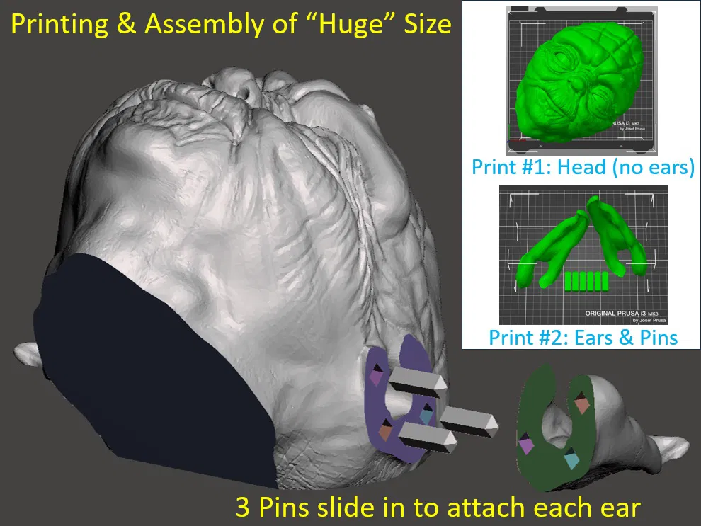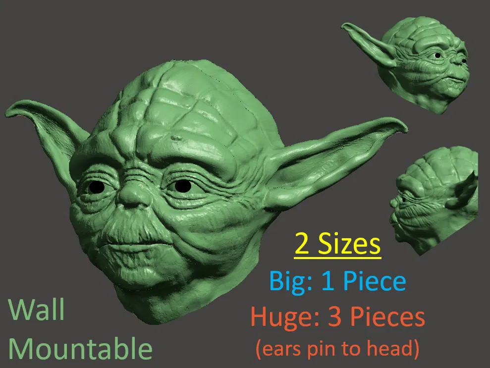 Tượng bán thân Yoda này rất dễ in; phiên bản khổng lồ 3 mảnh này sẽ in mà không cần hỗ trợ. Phiên bản một mảnh chỉ cần hỗ trợ phía sau tai. Tùy chọn kích thước: * Lớn: Một mảnh. Tên tệp là “Yoda (1 Piece)_Head-For-Wall”.