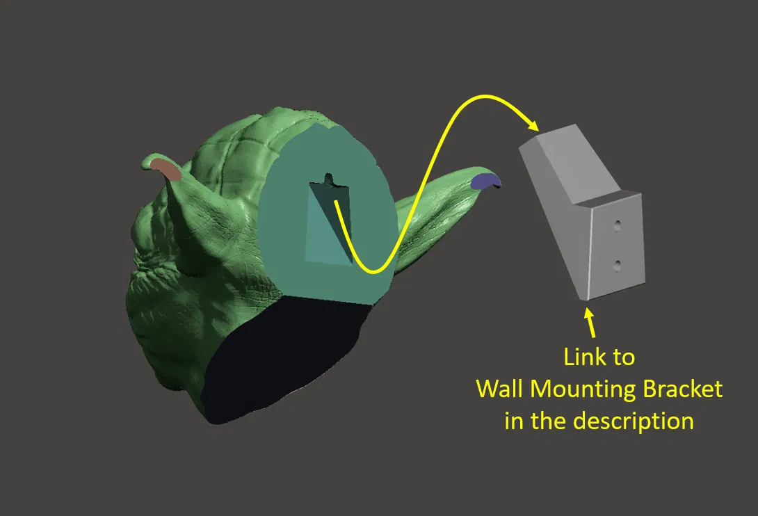 - Khổng lồ: Ba mảnh + chốt, hai bản in khác nhau. In “Yoda Head (No Ears)_For-Wall” và “Yoda Ears & Pins_For-Wall”. Bản in thứ hai có cả hai tai và sáu chốt để gắn chúng vào đầu. Tôi cũng đã bao gồm các tệp của cả hai tai và chốt riêng biệt. Lắp ráp kích thước “Khổng lồ”: Chỉ cần trượt các chốt vào đầu (đầu nhọn hướng ra ngoài về phía tai) và sau đó trượt tai vào. Có thể dùng một ít keo, nhưng không cần thiết. Tôi đã bao gồm tệp “3MF” với cấu trúc phân lớp dạng tia được tối ưu hóa để dễ dàng in và giảm thiểu lượng sợi nhựa cần thiết cho cả ba tệp được mô tả trong phần “Tùy chọn kích thước” ở trên. Tôi cũng bao gồm các tệp “.gcode” cho Prusa MK3/S/S+; nếu bạn có một trong những máy đó, bạn có thể sử dụng tệp đó để bắt đầu in ngay mà không cần phải cắt lát mô hình. Để xem các mô hình tương tự, hãy xem Bộ sưu tập đầu/tượng động vật mà tôi đã thiết kế hoặc sửa đổi. Tất cả các thiết kế này đều sử dụng cùng một giá đỡ để gắn, làm cho chúng có thể thay thế cho nhau. Bộ sưu tập đó bao gồm Darth Vader và Mũ bảo hiểm Stormtrooper. ##### Tùy chọn lắp ráp: * Giá đỡ để treo tường - gắn chắc chắn vào tường bằng một vít (sử dụng lỗ trên cùng).