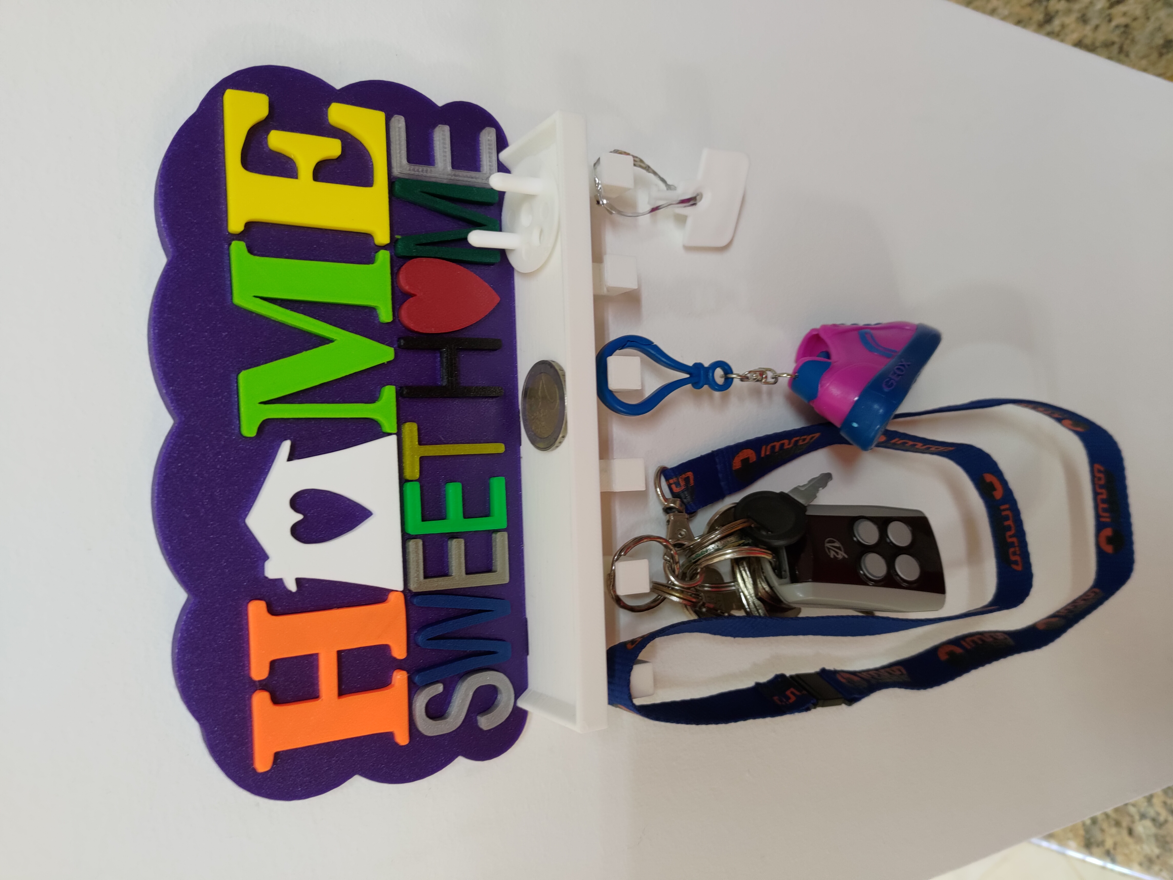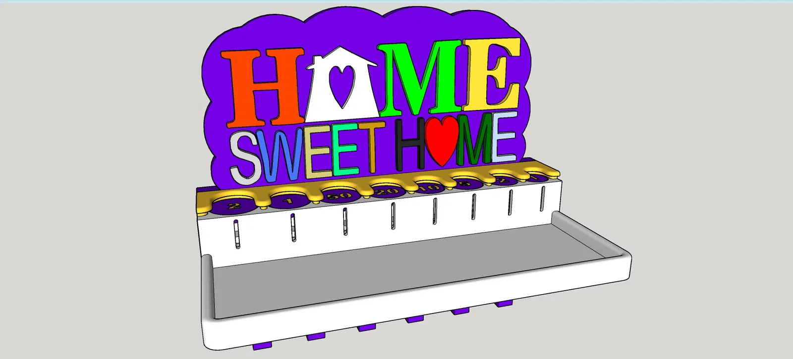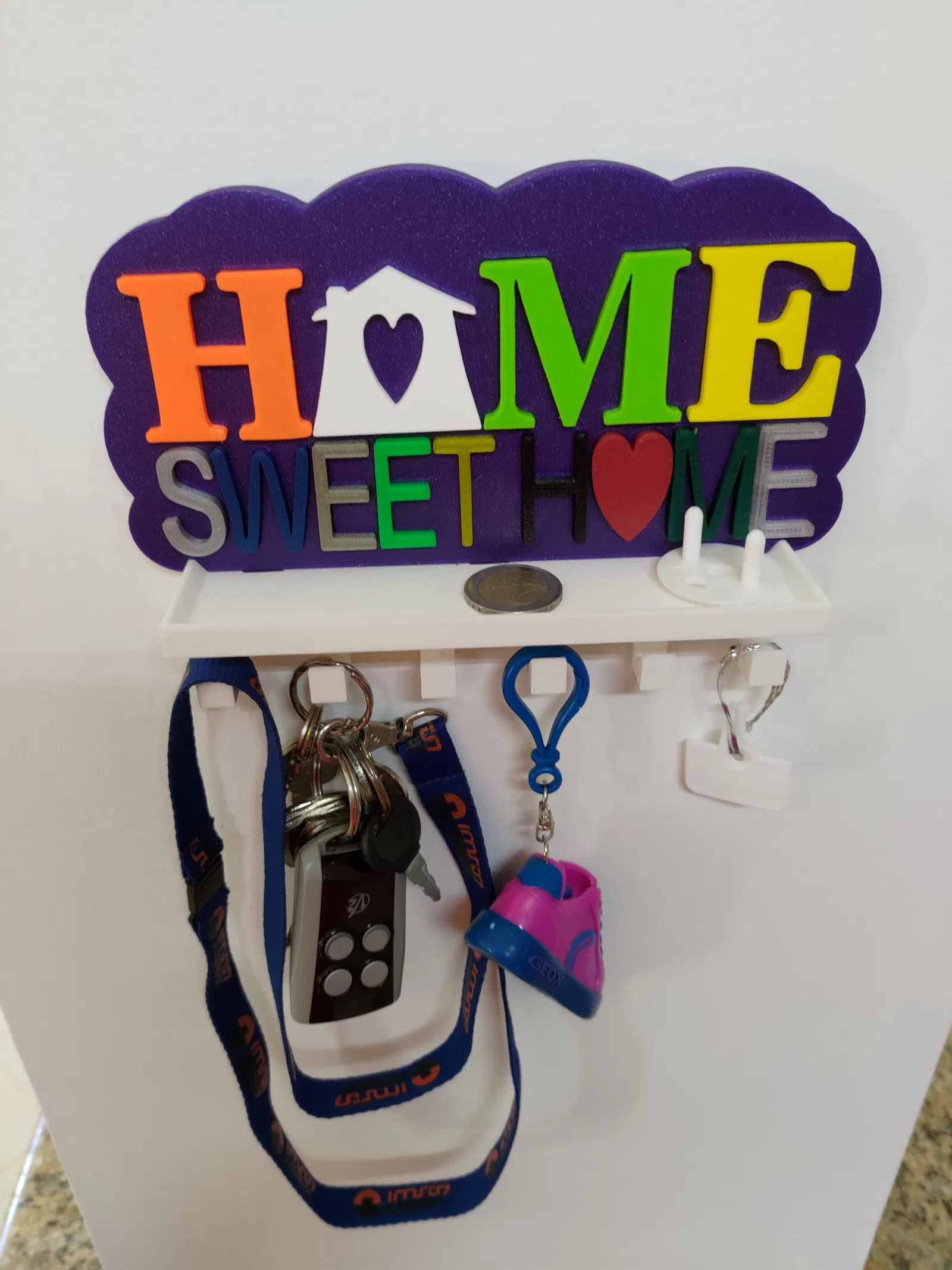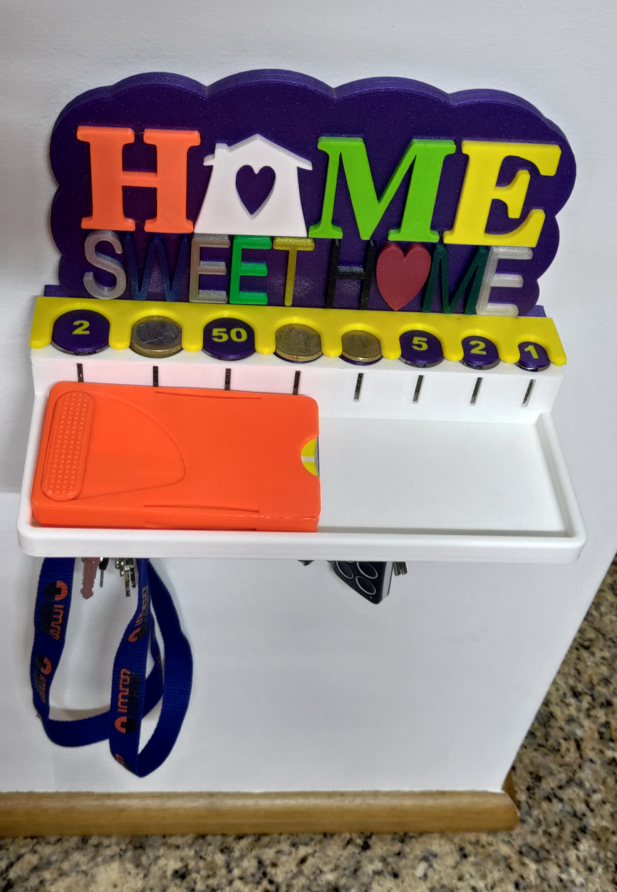 Vợ tui nhờ tui làm cái móc chìa khóa cho bếp, chỗ để chìa khóa, remote cửa cuốn cửa xe mà còn dư chỗ để mấy thứ lặt vặt hay bỏ túi như tiền xu hay gì đó. Sau khi tìm trên mạng thì tui cũng kiếm được cái mẫu hay hay rồi làm cái này. Mong mọi người thích nha. Trong trường hợp của tui thì tui in mấy cái chữ bằng nhiều màu và vật liệu khác nhau, nhưng mà tùy mỗi người chọn vật liệu thôi. Trong cái dự án này thì tui dùng PLA, PETG và ABS, in lớp dày 0.2mm, vì tui muốn nó có nhiều màu nhất có thể nên tui dùng hết mấy cuộn filament có sẵn bất kể loại gì. mấy cái chữ thì nó khít với đế, nhưng tui có dùng keo dán nhựa để cố định lại cho chắc. cái khay thì nó cũng khít với đế nên tui không có dán, thực tế là tui đang dự tính nâng cấp để cái này có thể tháo ra lắp vô cái mới, kiểu như lego. Lưu ý: Nếu mấy bạn muốn in chữ riêng lẻ hoặc có cái khay lò xo nhám, tui khuyên nên lật ngược chữ và đế lại để có bề mặt nhám ở mặt trước của các chi tiết như tui đã làm, cái này sẽ làm cho sản phẩm hoàn thiện hơn. 25/06/2022 Sửa file base.stl lại, hết lỗi khi import vô slicer. Cảm ơn Killerklamsi đã báo lỗi này nha. 12/03/2025 Bổ sung vô cái móc chìa khóa cũ, giờ có thêm file mới cho cái chỗ để tiền xu, có 2 loại khay và 1 loại không có khay. Cái chỗ để tiền xu này dựa trên dự án của MAXimator tìm thấy trên Thingiverse và Printables theo link bên dưới: https://www.thingiverse.com/thing:2275395 Lưu ý: Cái chỗ để tiền xu này cần có lò xo, giống như mẫu gốc thì loại lò xo ở link bên dưới là một lựa chọn: https://www.amazon.de/dp/B00GN3BJT4/?tag=eselkfilmeabs-21