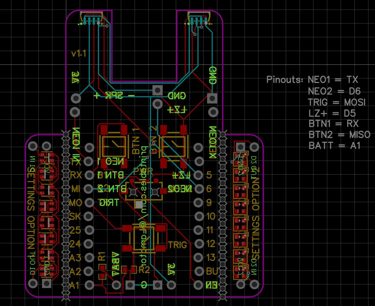 Thiết kế mạch được tạo ra để đặt trên adafruit rp2040 propmaker. Tách các phần dãy led ở hai bên, sau đó hàn phần chunk bên hông mà bạn thích hơn lên trên, dùng header cơ bản để nâng lên. Ảnh không nhất thiết cho thấy mạch "v5" đã sửa đổi trong quá trình lắp ráp.