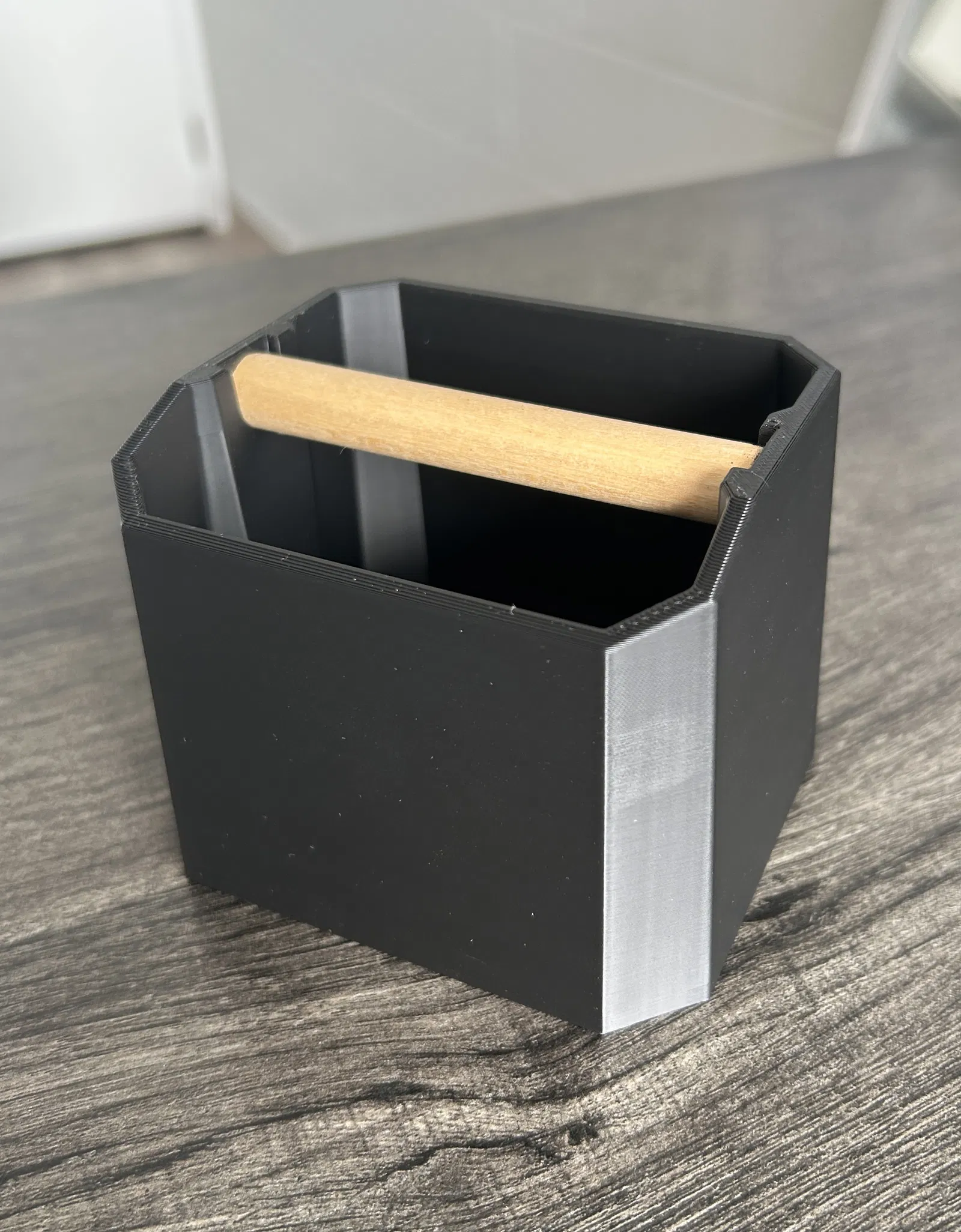 Hộp đập bã cà phê espresso nhỏ gọn với thiết kế hiện đại. Sử dụng thanh gỗ tròn 12mm làm bề mặt đập. Có thể tùy chỉnh kích thước thanh gỗ hoặc file FreeCAD nếu cần.