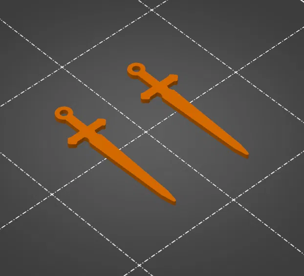 Mô hình kiếm 3D làm bông tai hoặc móc khóa xịn sò, nhỏ gọn nhẹ tênh. Có 2 mẫu: trơn hoặc có thêm trăng lưỡi liềm. Khuyên nên in có brim để cạnh bén và dính tốt hơn. Không cần support, scale tùy ý.