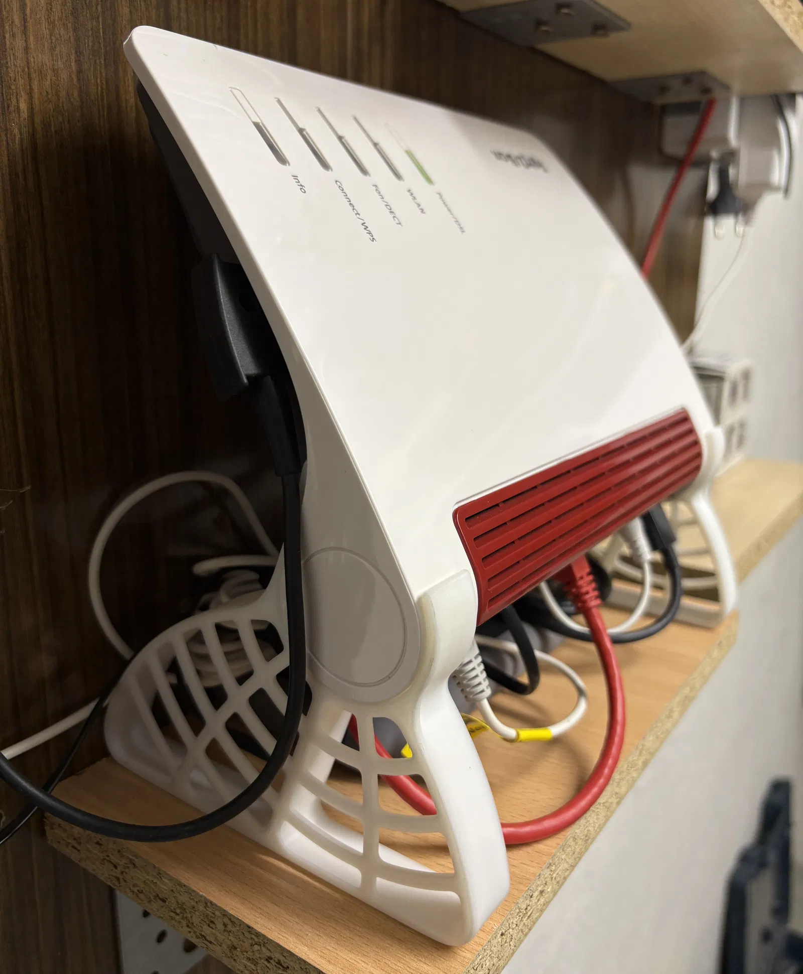 Cái chân đế này giúp đặt Router FritzBox 7590 ở vị trí nghiêng, giúp kết nối cáp dễ dàng và cải thiện khả năng thông gió. Có đủ không gian bên dưới cho ổ SSD nhỏ.