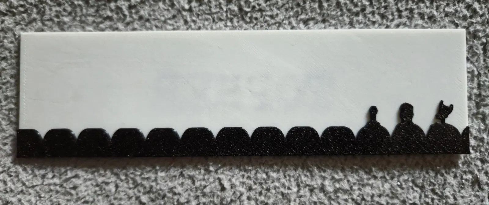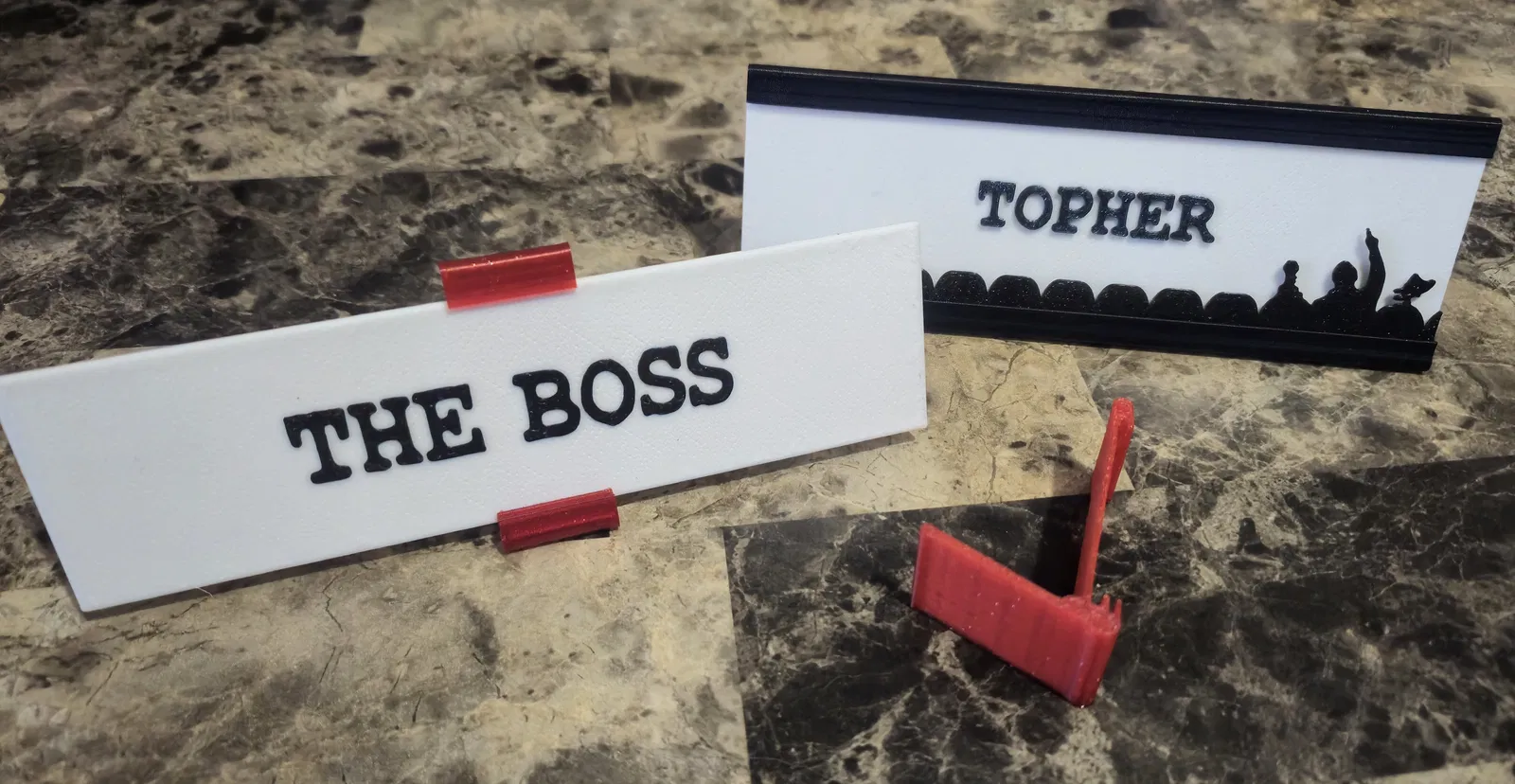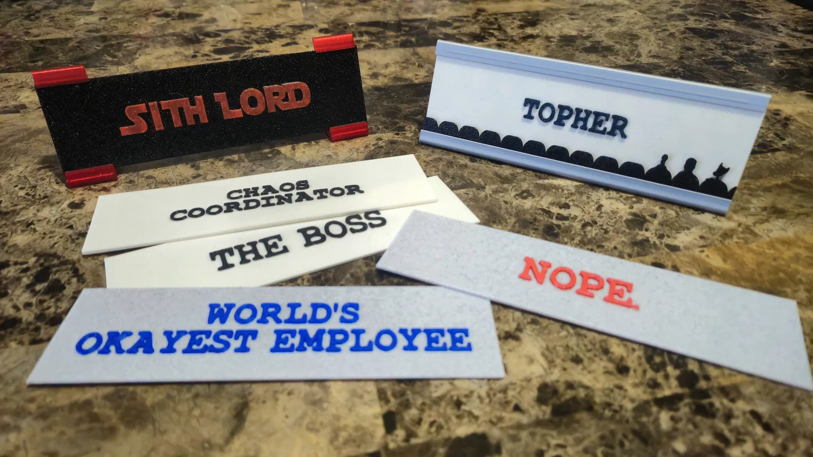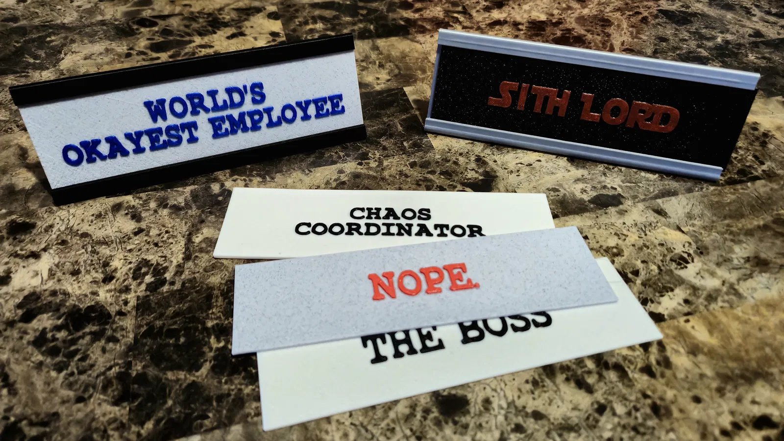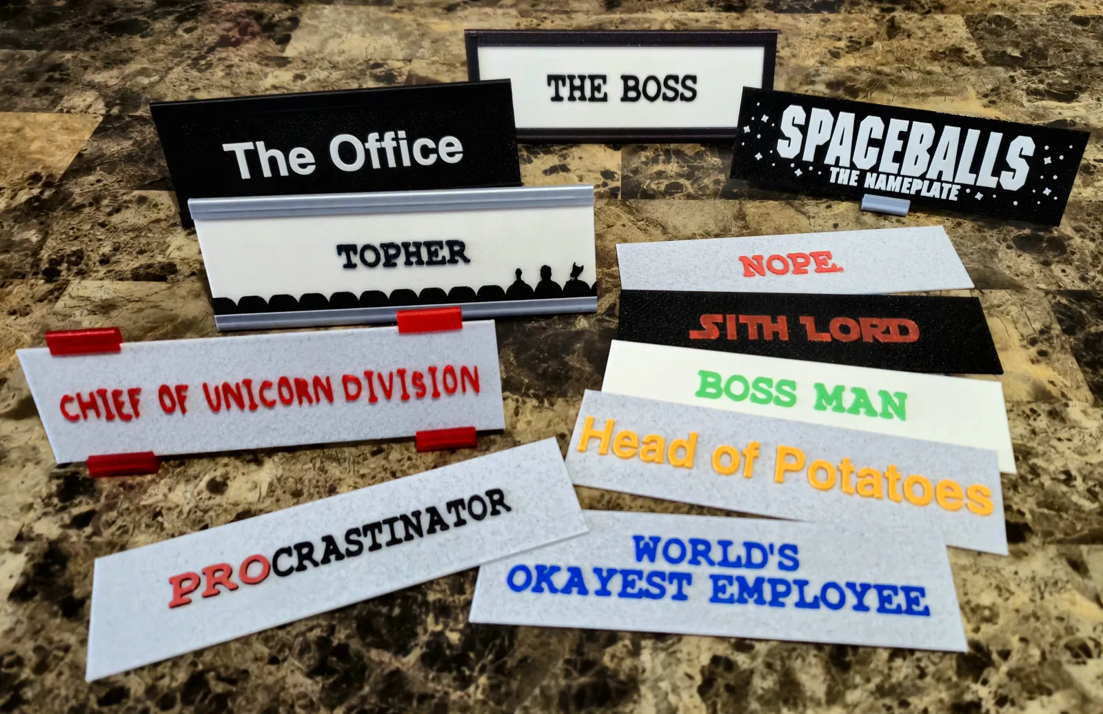 Tôi muốn có một cái bảng tên đơn giản, kích thước bình thường cho studio làm việc chung của tôi. Ban đầu tôi chỉ làm một cái thôi, nhưng rồi tôi làm quá tay luôn… Nên giờ có rất nhiều mẫu để bạn lựa chọn, tất cả đều in liền với nhau, và có thể hoàn thành trong vòng chưa đầy một giờ (tùy thuộc vào mẫu bạn in và cài đặt). Phần đế đỡ (holder) in nằm ngang mà không cần hỗ trợ, còn phần bảng tên và các phụ kiện MST3K thì in úp mặt xuống (cài đặt bên dưới). Có nhiều bảng tên đi kèm, kèm theo một bảng trống để bạn tự làm nhé! QUAN TRỌNG: Hãy để các bảng tên và/hoặc phụ kiện MST3K nguội hẳn sau khi in! Nếu bạn định dùng đế đỡ MST3K và phụ kiện đi kèm, tôi khuyên bạn nên in các mẫu chữ MST3K được chỉnh offset. Hoặc nếu bạn tự làm, hãy đặt chữ lệch tâm khoảng 3mm so với đường giữa. Bạn có thể thử làm mỏng bảng tên để tiết kiệm sợi nhựa hơn, nhớ làm nguội kỹ sau khi in nhé. CẬP NHẬT - Ngày 3 tháng 3, 2025 Thêm 2 mẫu bảng tên cho giáo viên tiểu học! Từ Mẫu giáo đến Lớp Sáu. Kèm theo các mẫu trống để bạn cá nhân hóa. CẬP NHẬT - Ngày 4 tháng 3, 2025 Thêm đế đỡ Tri-Holder. Giờ bạn có thể gắn tới 3 bảng tên cùng lúc! --------------------------- Cách tôi đã in: In bằng PLA với đầu phun 0.4mm. Đế đỡ bảng tên - Chiều cao lớp: 0.3mm, 40% Infill, Họa tiết mặt trên Hilbert Curve. Bảng tên - Chiều cao lớp: 0.2mm, 15% Infill, Họa tiết mặt trên Hilbert Curve. Tạm dừng in ở LỚP 8 [Chiều cao 1.60] để đổi màu. Phụ kiện MST3K: Chiều cao lớp: 0.2mm, Họa tiết mặt trên Hilbert Curve. --------------------------- 'MST3K Add-On V1' có thể thực hiện được nhờ @bloblob_31762: 'MST3K Add-On V2' có thể thực hiện được nhờ @omiedude: