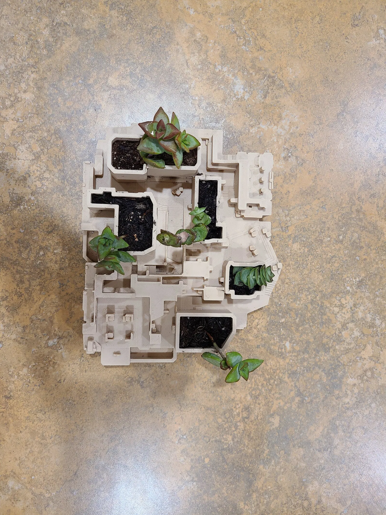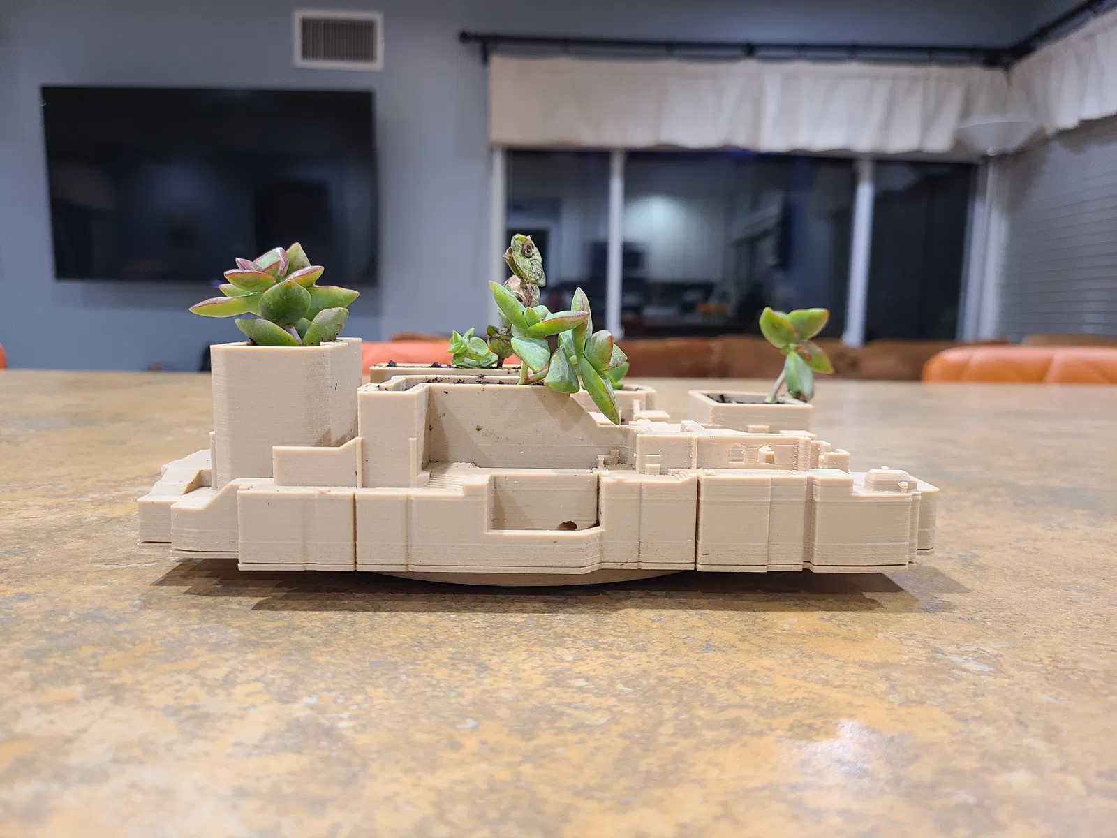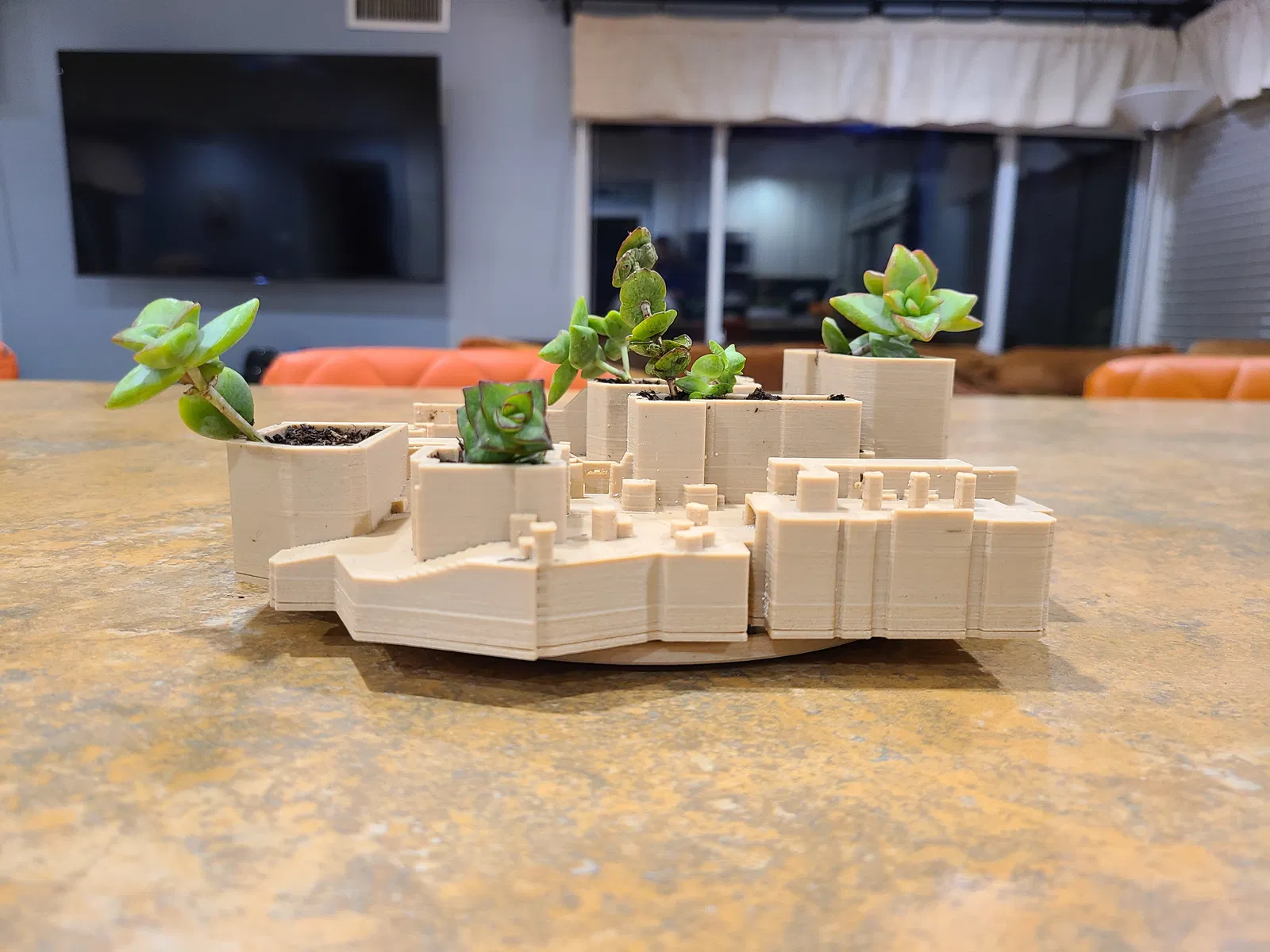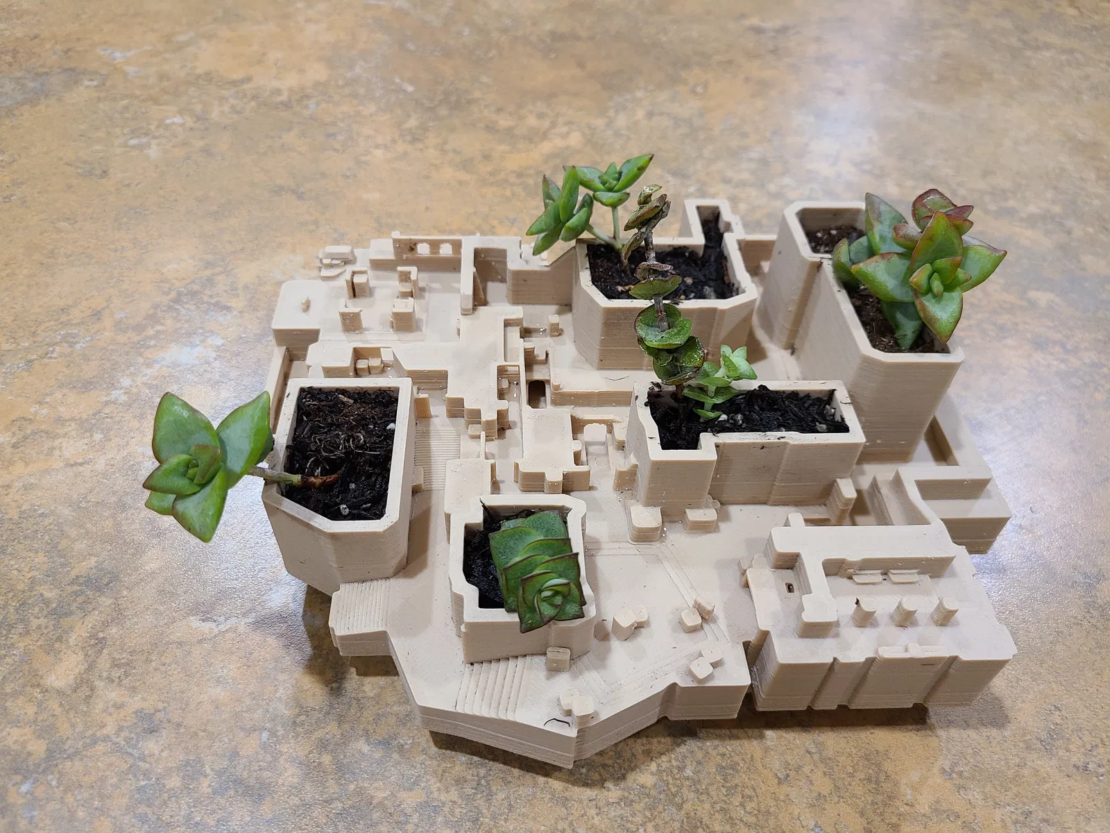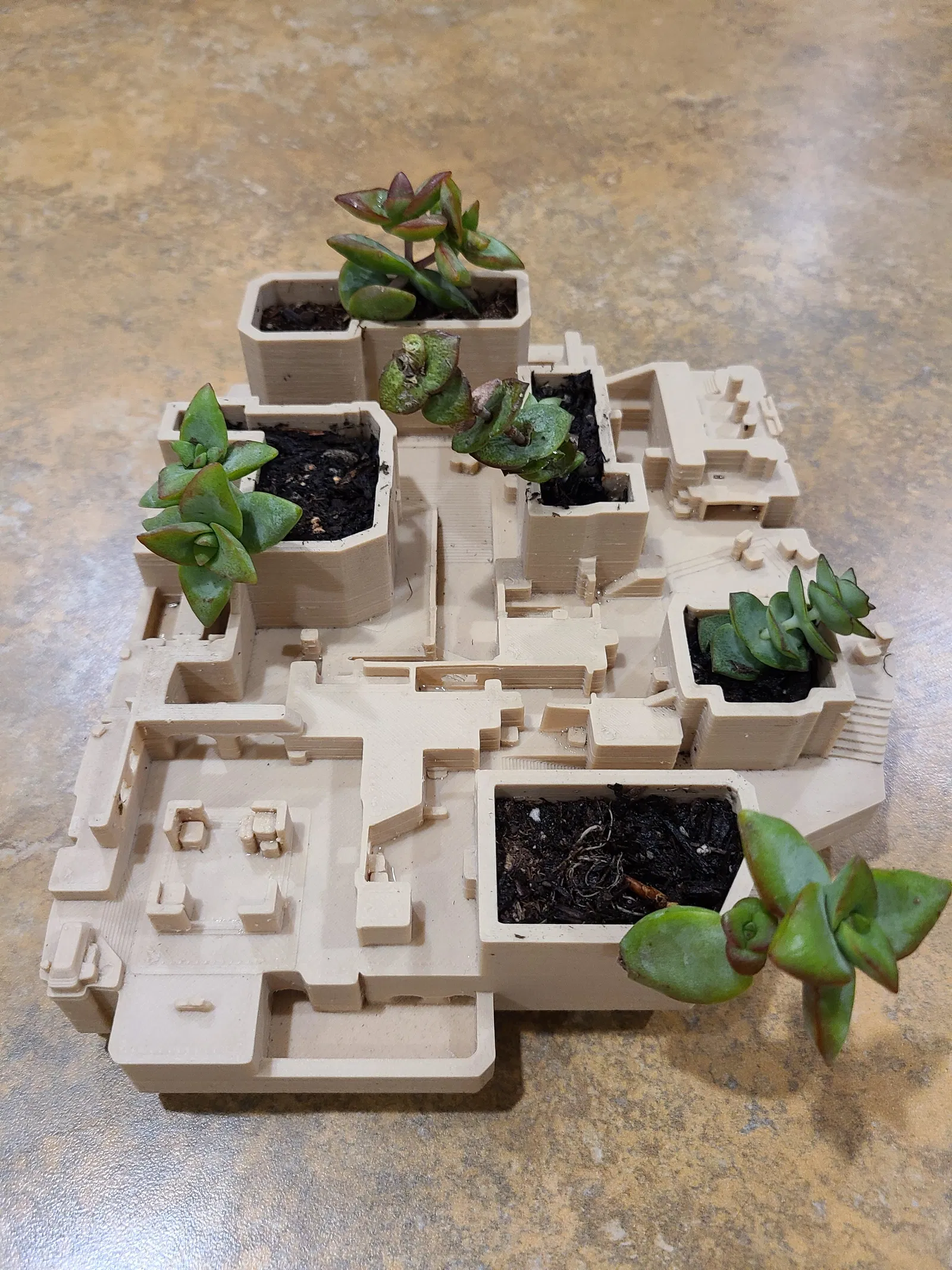 Bản đồ de_mirage kinh điển trong Counter-Strike đã được biến tấu thành một chậu cây mọng nước nhỏ. Phiên bản bản đồ này là từ Global Offensive (CSGO). Tôi thích ngắm nhìn nó từ mọi góc độ, nên đã đặt toàn bộ lên một cái bàn xoay nhỏ.